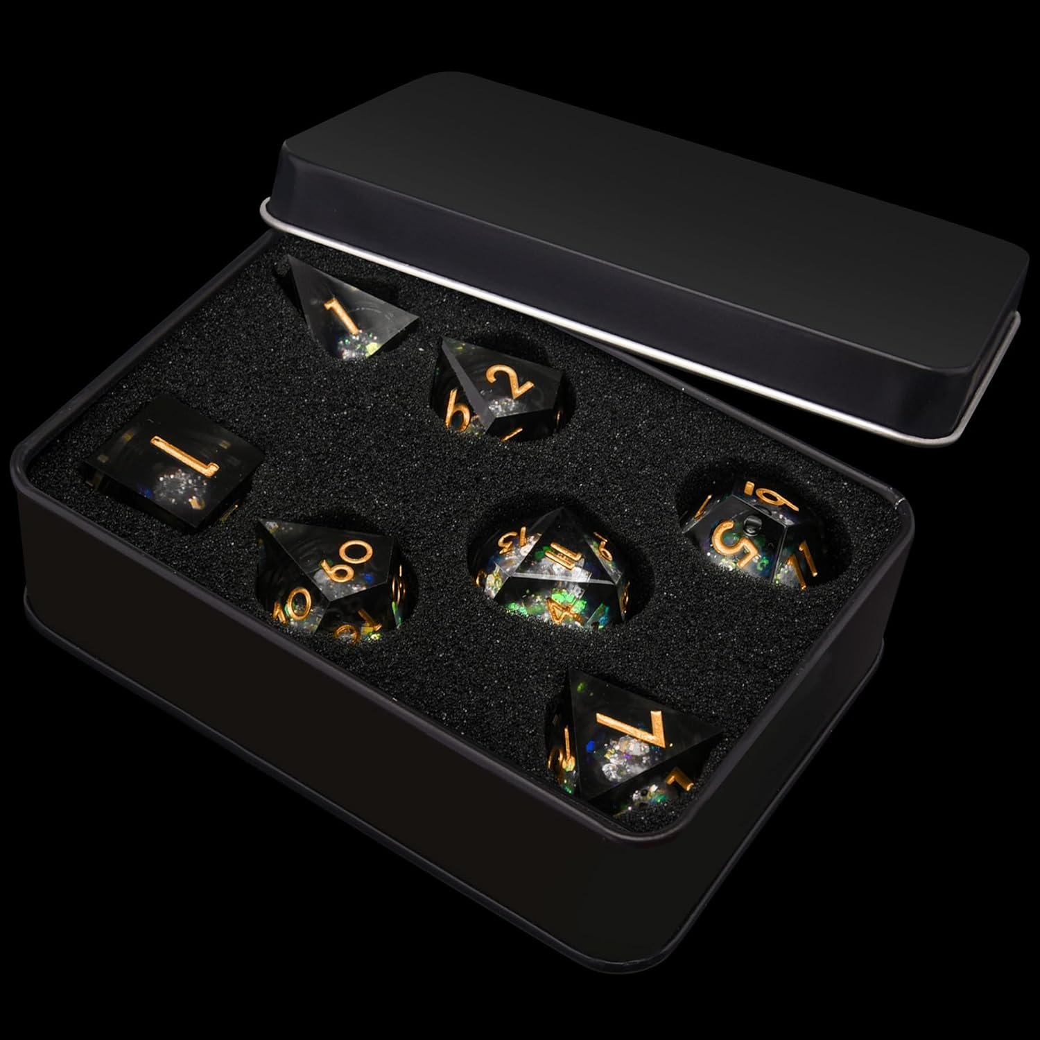 AUSTOR Liquid Core Resin DND Dice Sharp Edge Polyhedral Dice 7-Die DND Dice Set Quicksand Handmade Resin Dice for Dungeons and Dragons RPG MTG Table Games, Black