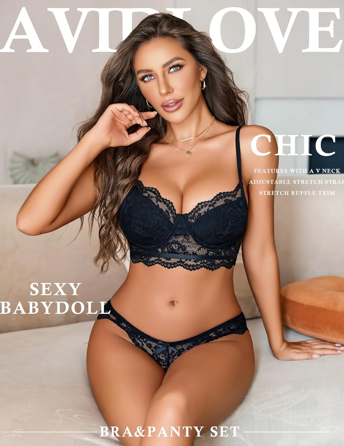 Avidlove Lingerie for Women Lace Strappy Underwear V Neck Bra and Panty Sets 2 Piece Bralette Outfits