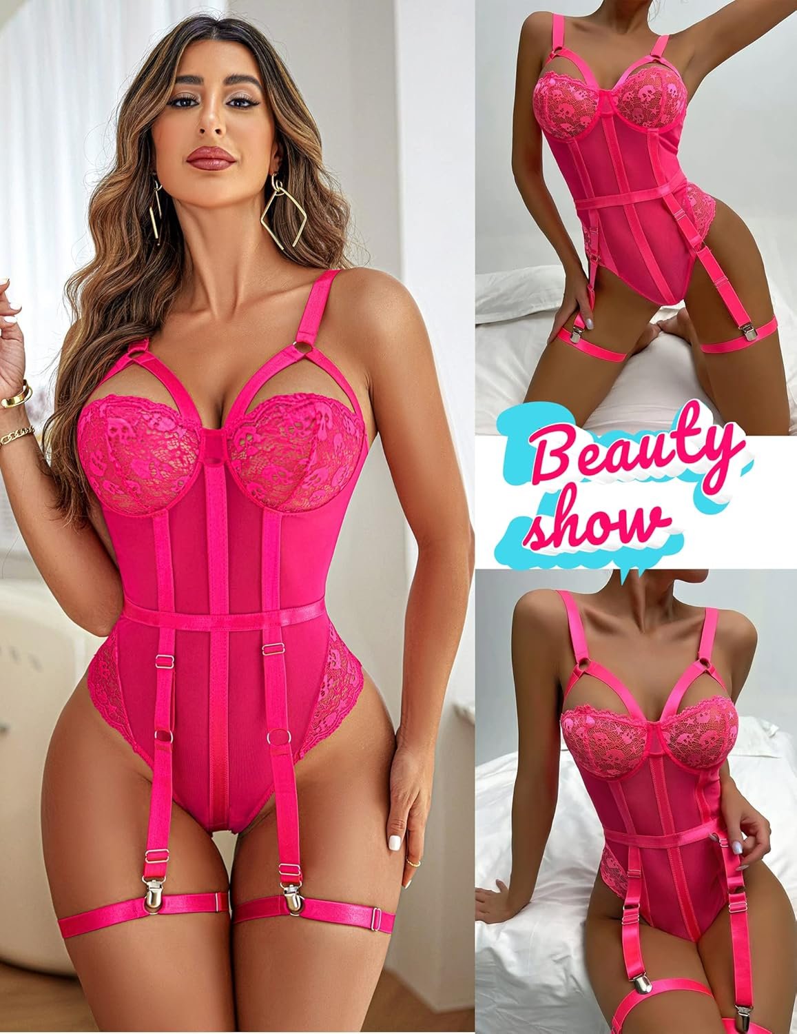 Avidlove Lingerie Sets for Women Sexy Lace Skull Corset with Garter Belt One Piece Teddy Bodysuit