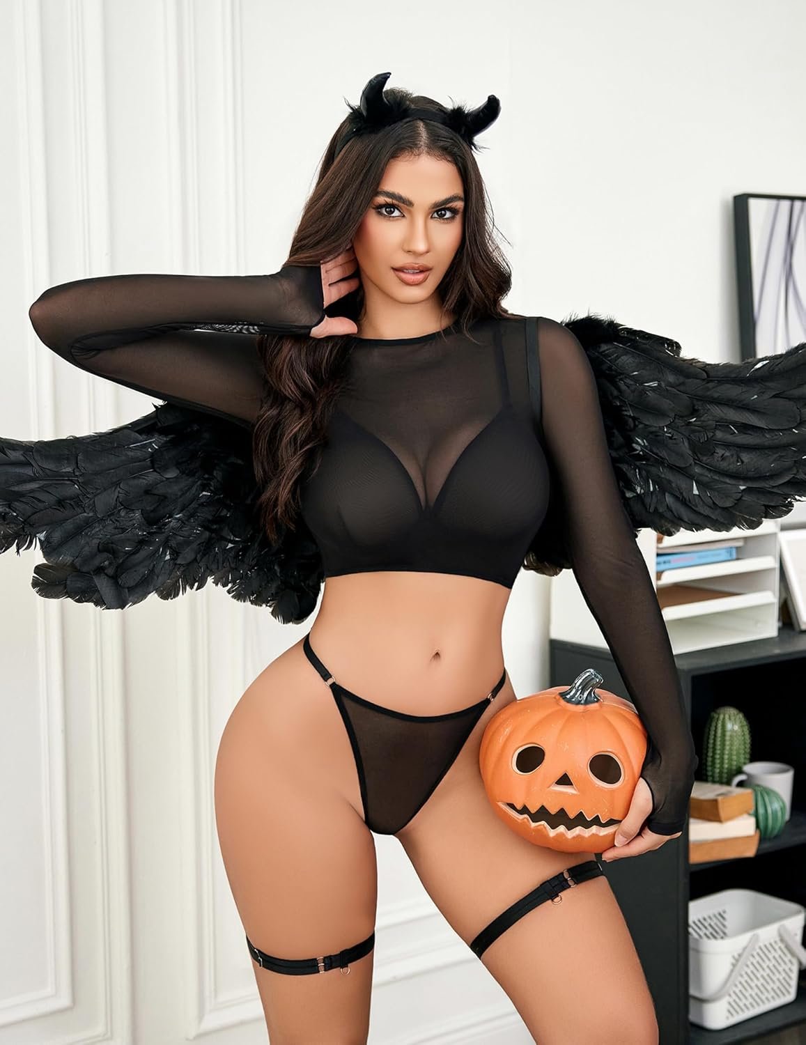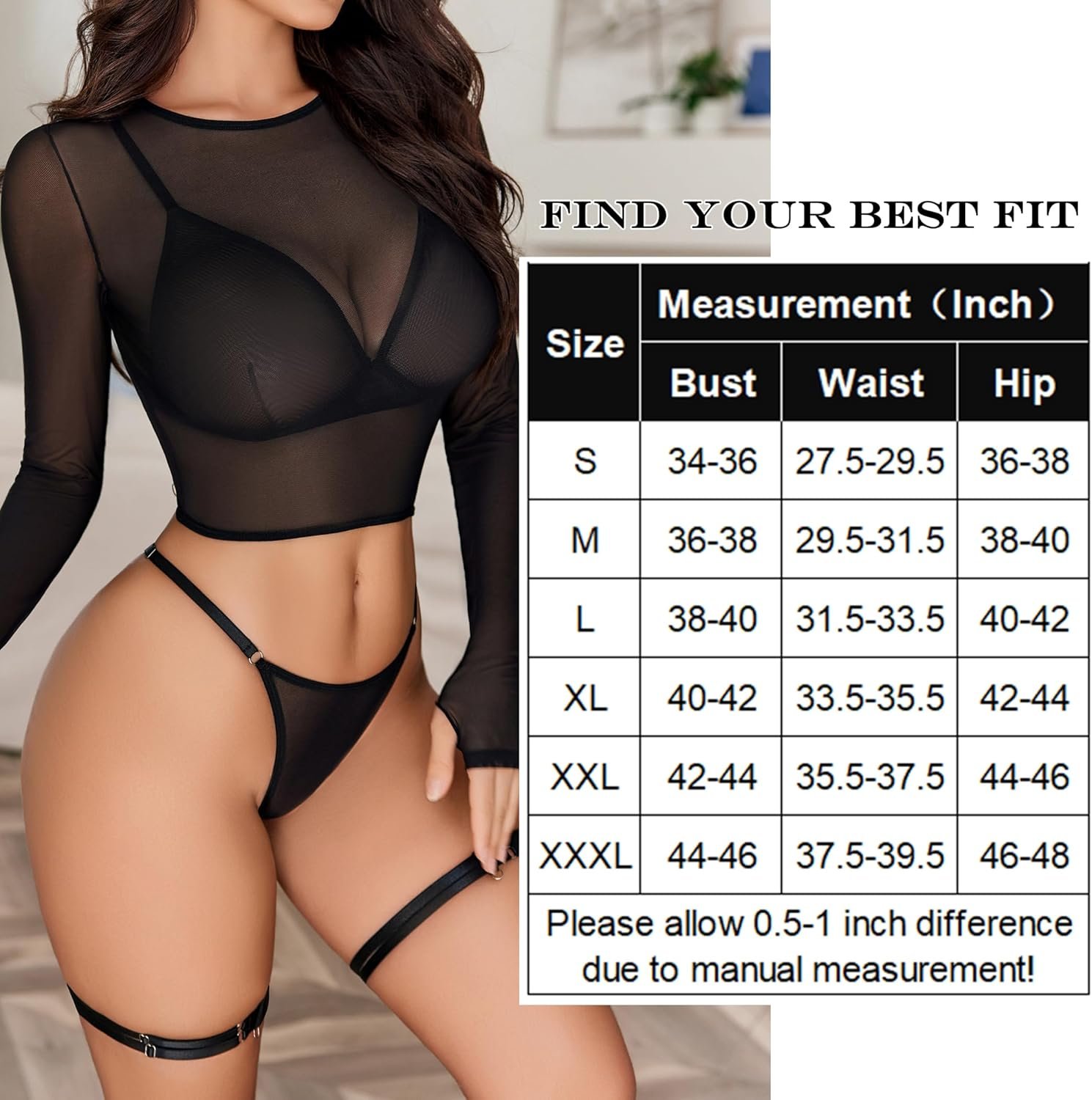 Avidlove Lingerie Sets for Women Sexy Rave Outfits Festival Mesh Long Sleeve Crop Tops Bra and Panty Sets