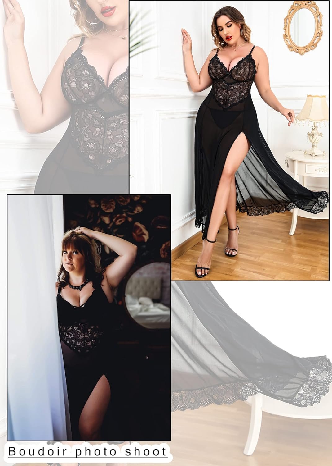 Avidlove Plus Size Lingerie for Women Sexy Lace Babydoll Long Lingerie Dress Side Split Nightgown