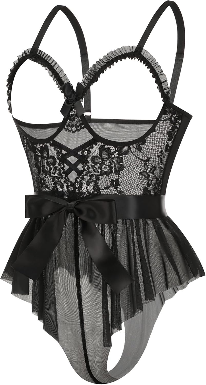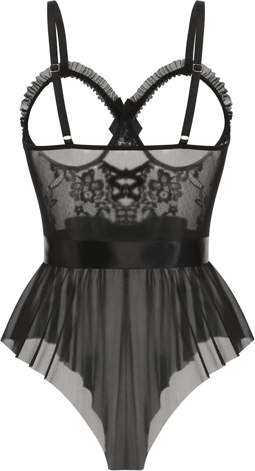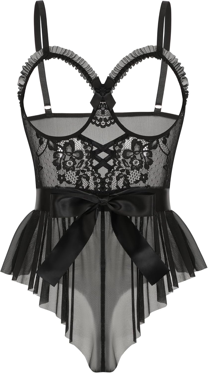 Avidlove Sexy Bow Ruffle Cut Out Sheer Mesh Lace Babydoll Lingerie Romper with Satin Ribbon