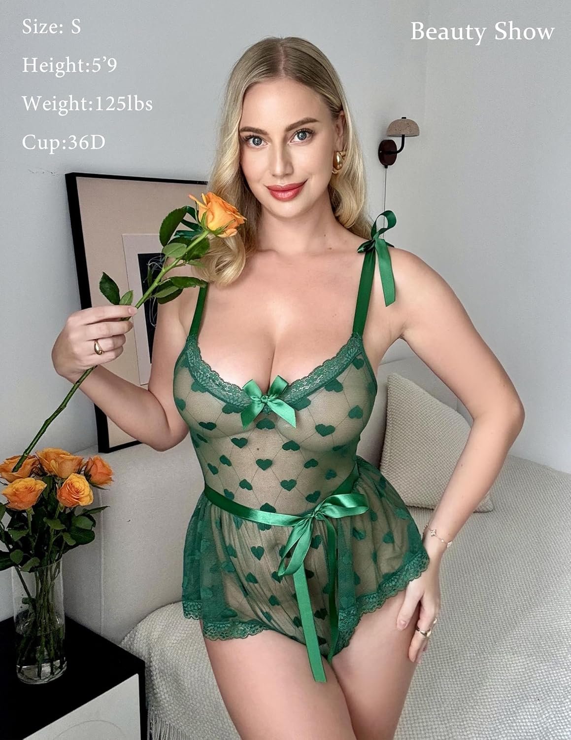 Avidlove Sexy Lingerie for Women Heart Sheer Mesh Lace Bodysuit See Through Lingerie Babydoll with Belt