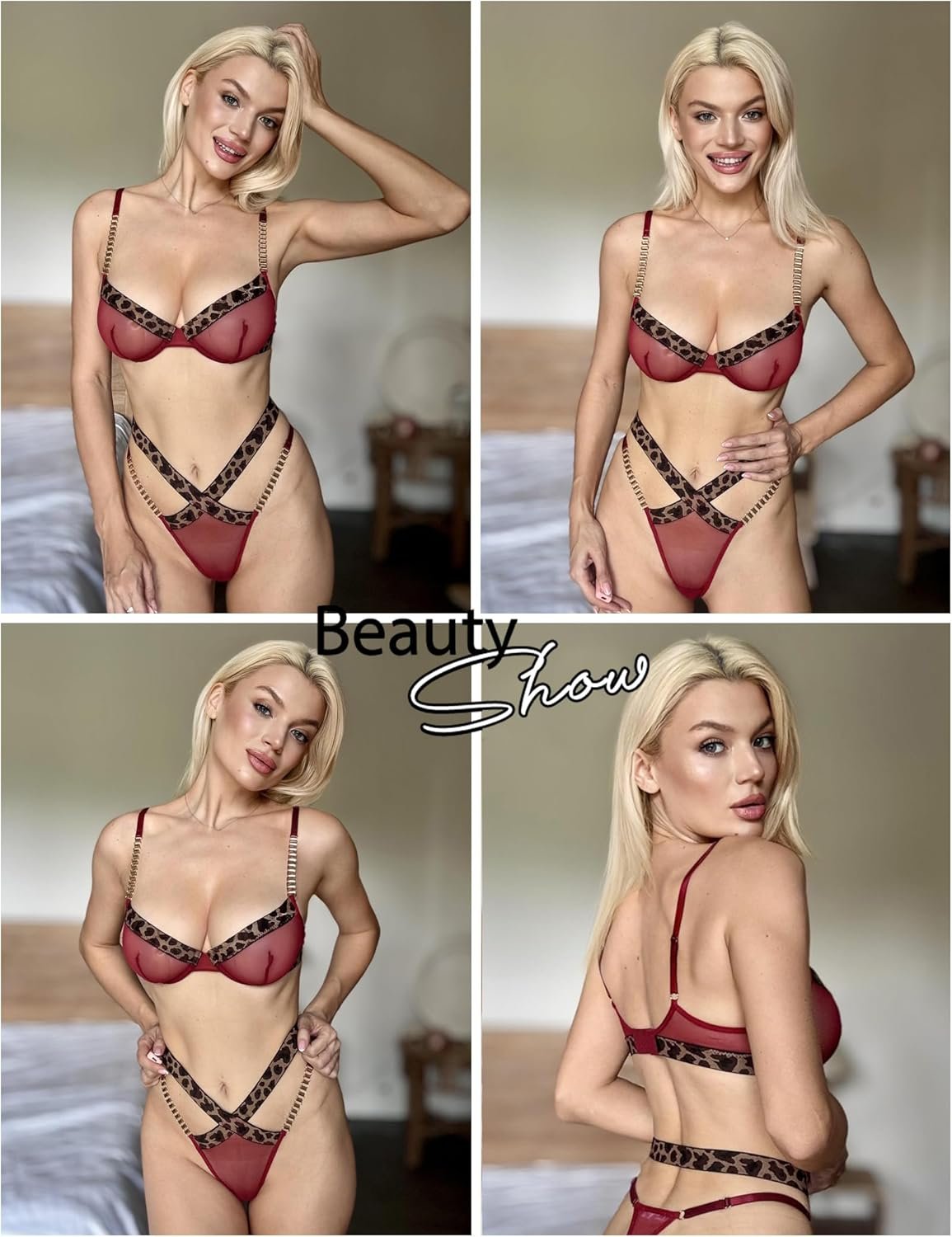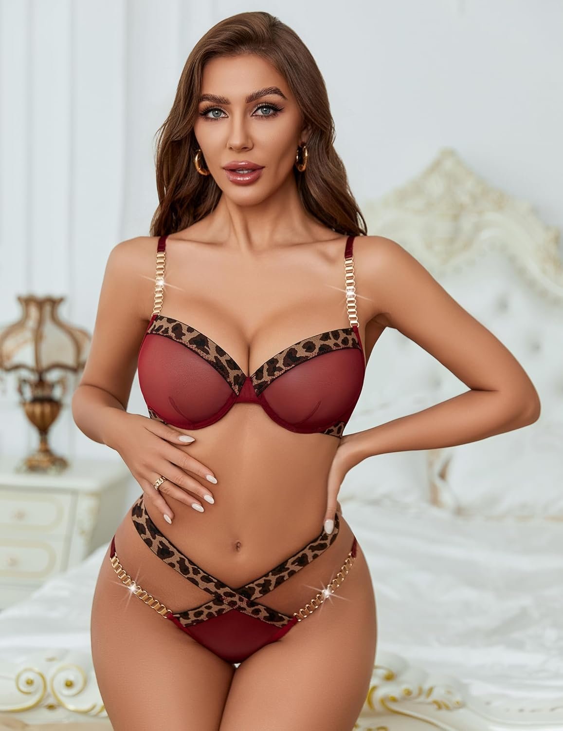 Avidlove Sexy Lingerie Set Mesh See Through Underwire Bra Panty Set Leopard Splice Push Up Lingerie with Chain