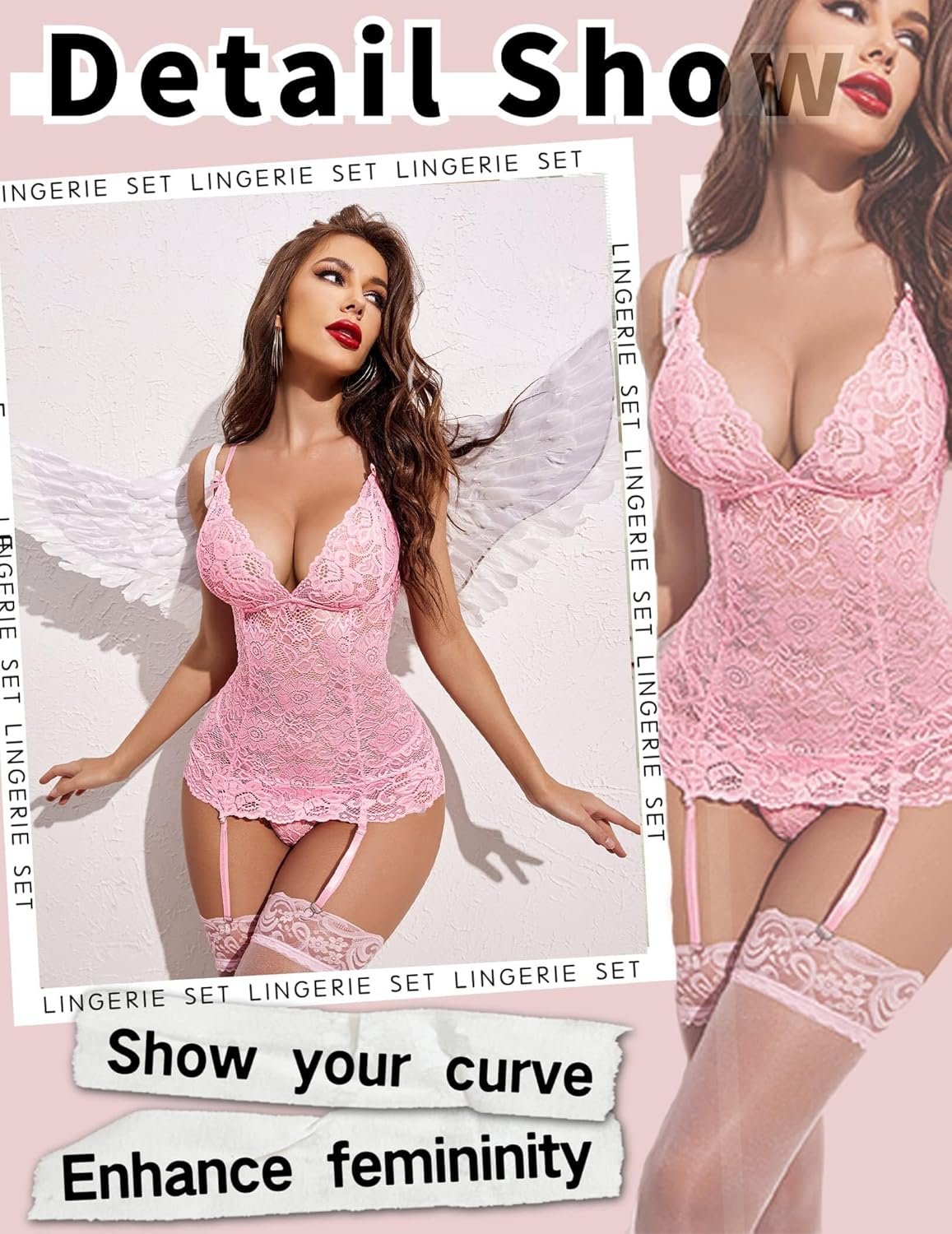 Women Sexy V-Neck Lace Floral Lingerie Sleepwear With Garter Belt( Thigh high stockings NOT included)