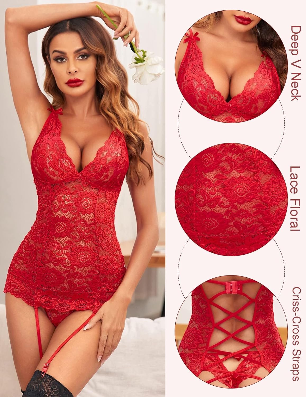 Avidlove Women’s Lace Babydoll with Garter Mini Teddy Bodysuit Sexy Lingerie Backless Chemise