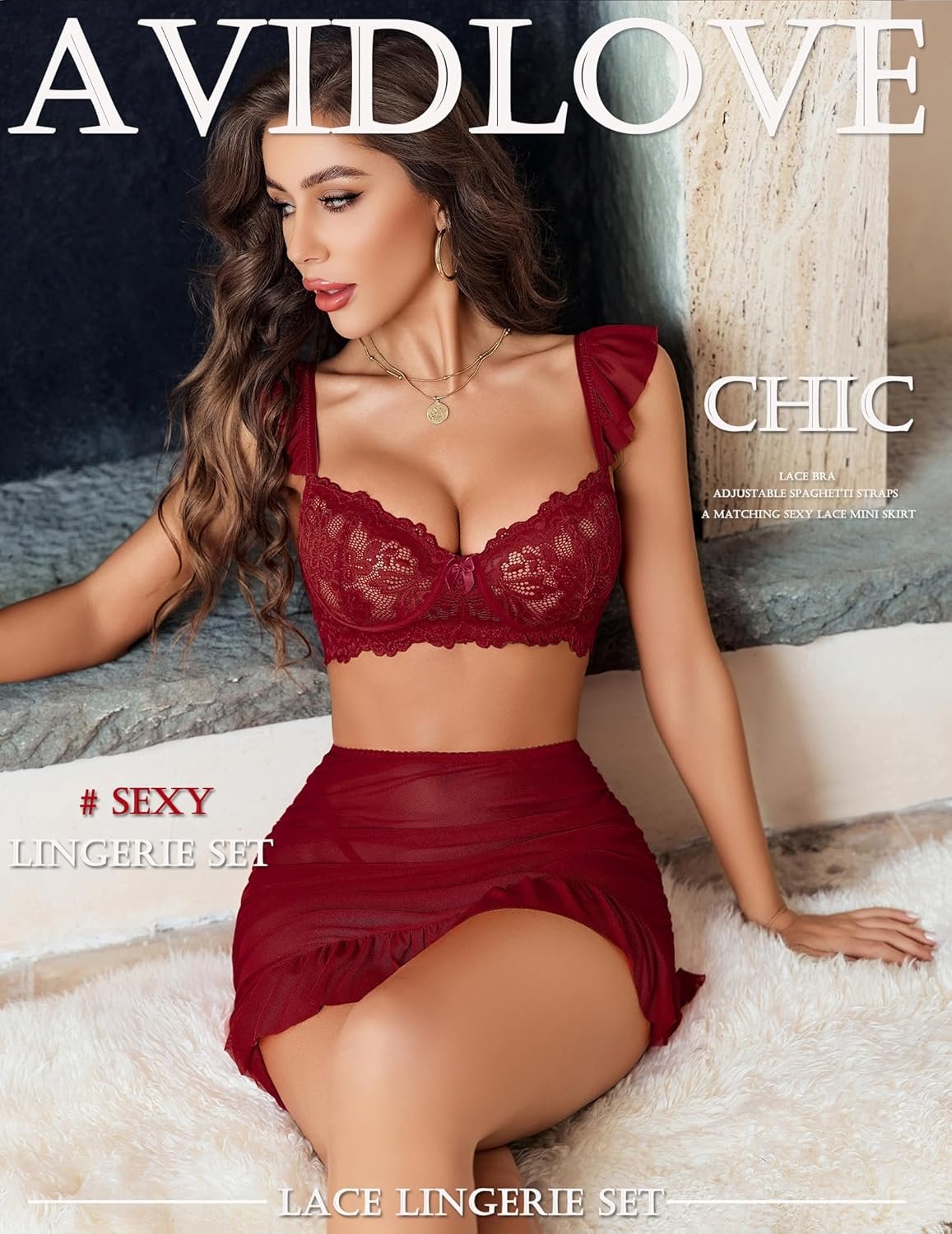 Avidlove Women Lingerie Set Lace Skirt and Bra 3 Piece Lingerie Set Chemise Ruffle Hem Sleepwear