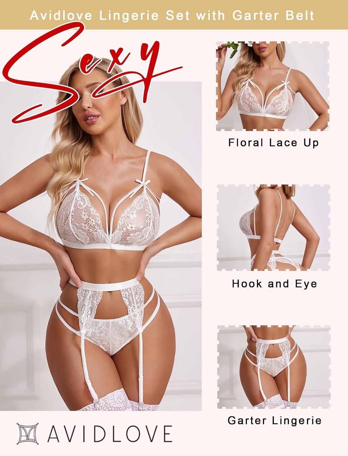Avidlove Women lace lingerie set features lace cups, satin bow accents, adjustable spaghetti straps, a hook back closure, a matching high waisted garter belt with adjustable garter straps.