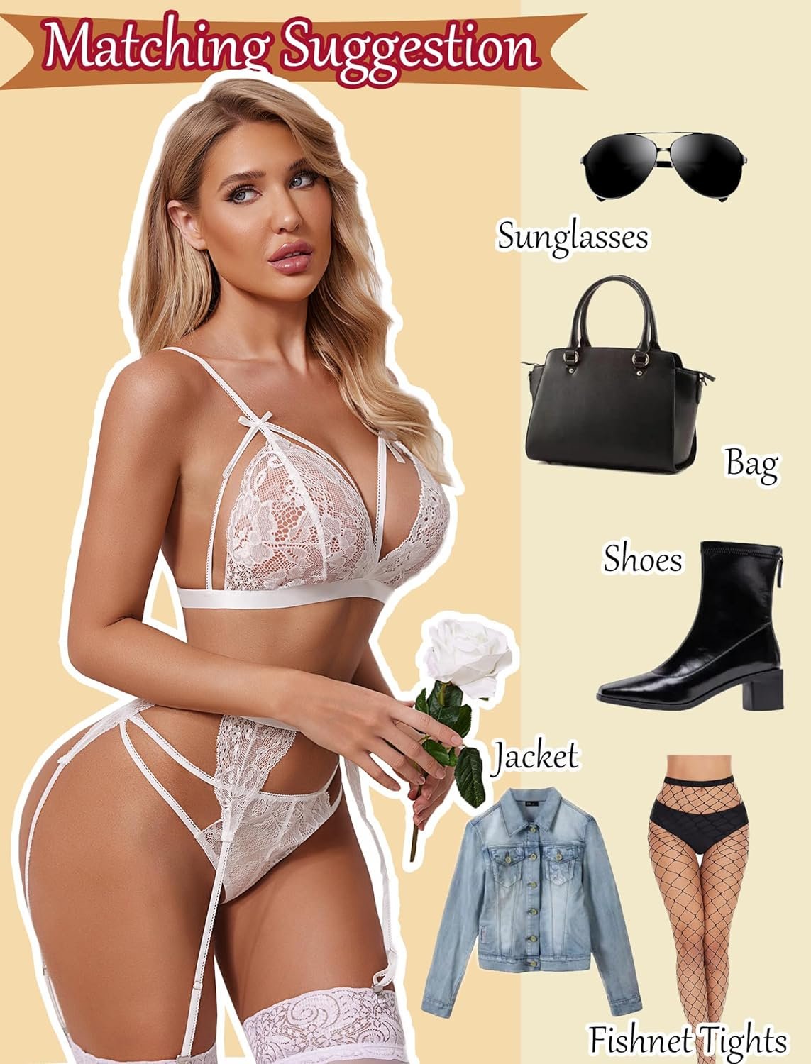 Customers find the lingerie set sexy, with one noting it comes with a cute plastic tote. The fit, material quality, comfort, and stretchiness receive mixed feedback – while some say it fits great and feels soft, others find it too big and the material flimsy. The lingerie quality and value for money also get mixed reviews, with some finding it perfect and worth the price, while others describe it as unflattering and not worth more than $5. The stockings are a significant issue, as many report they don’t come with the set.