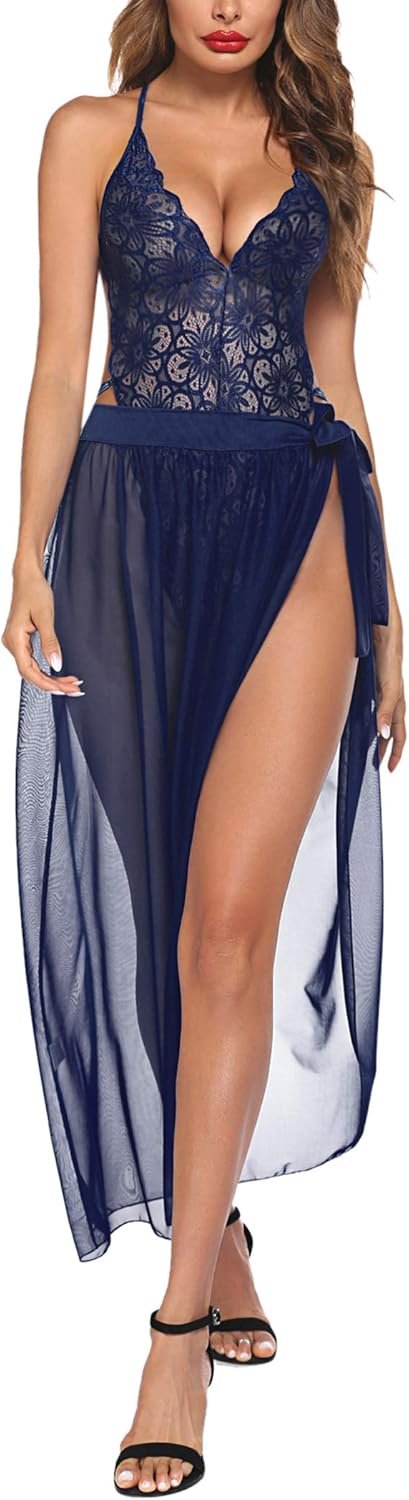 Avidlove Women One Piece Lingerie Deep V Lace Bodysuit Mosaic Lace Teddy Mesh Skirt