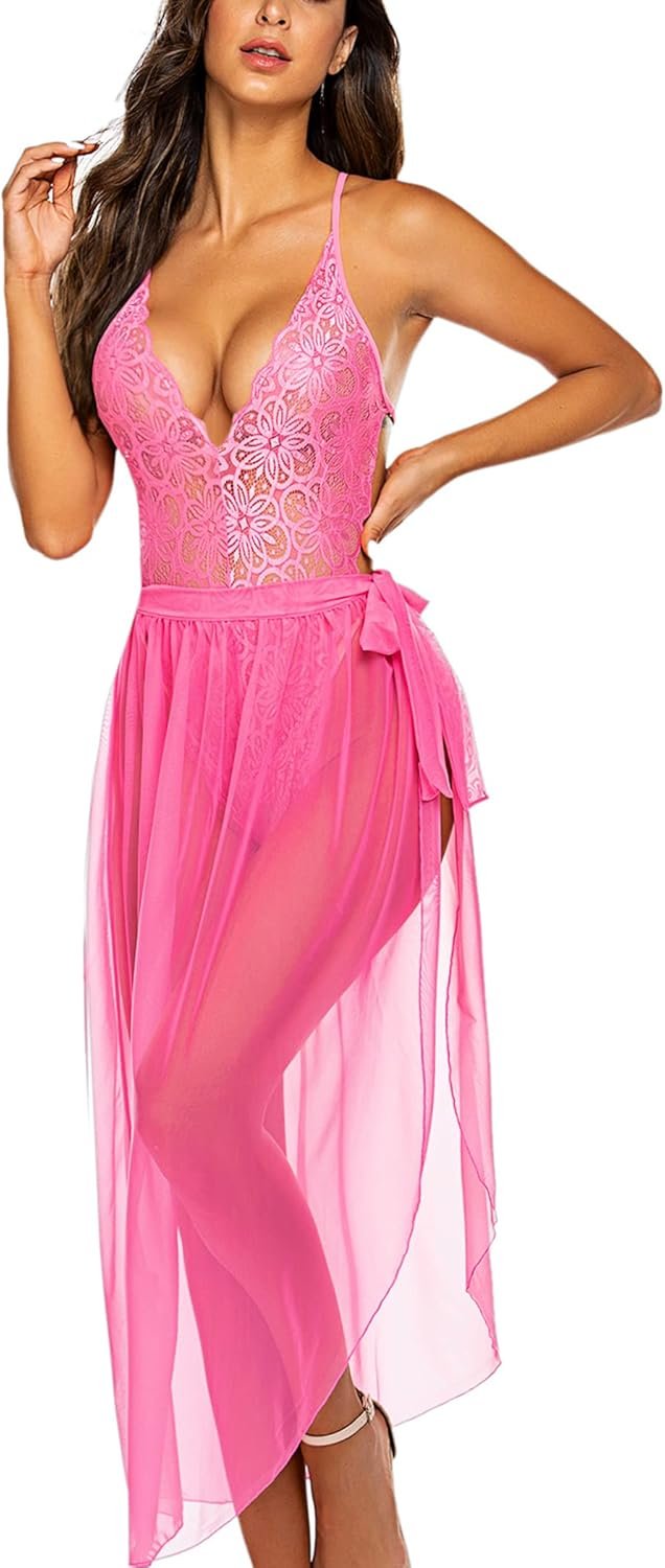 Avidlove Women One Piece Lingerie Deep V Lace Bodysuit Mosaic Lace Teddy Mesh Skirt