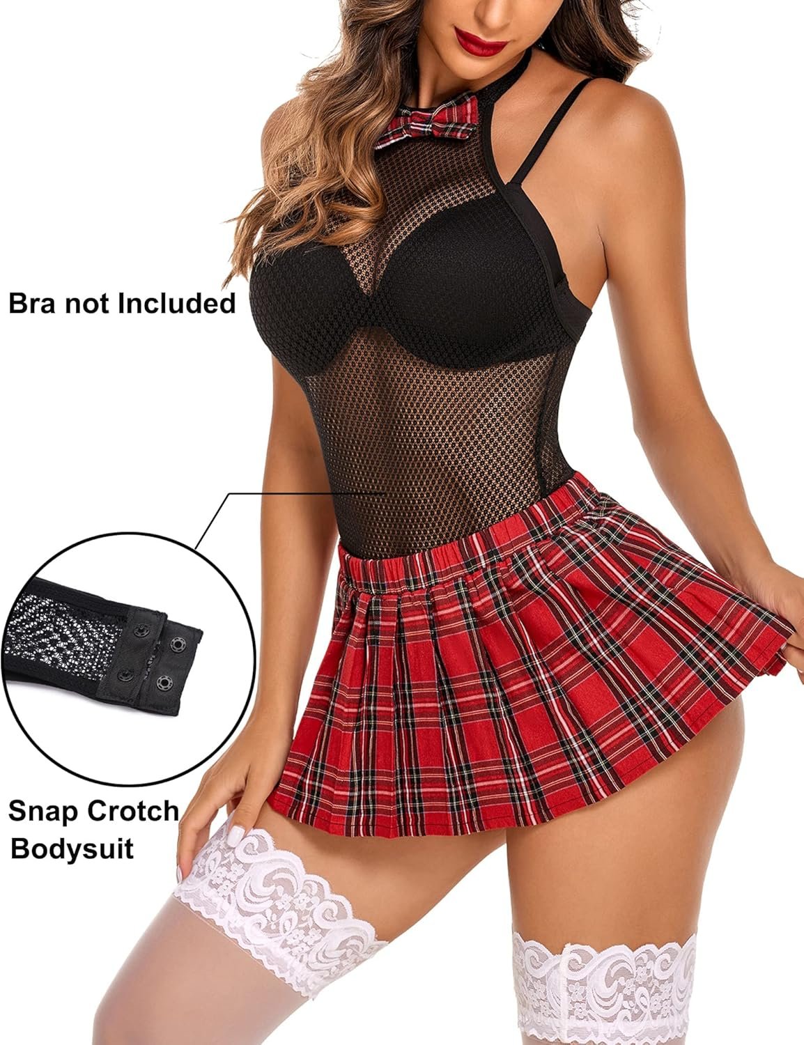 Avidlove Sexy Snap Crotch Bodysuit with Tie Top and Mini Pleated Skirt Set sexy lingerie for womensexy lingerie for women