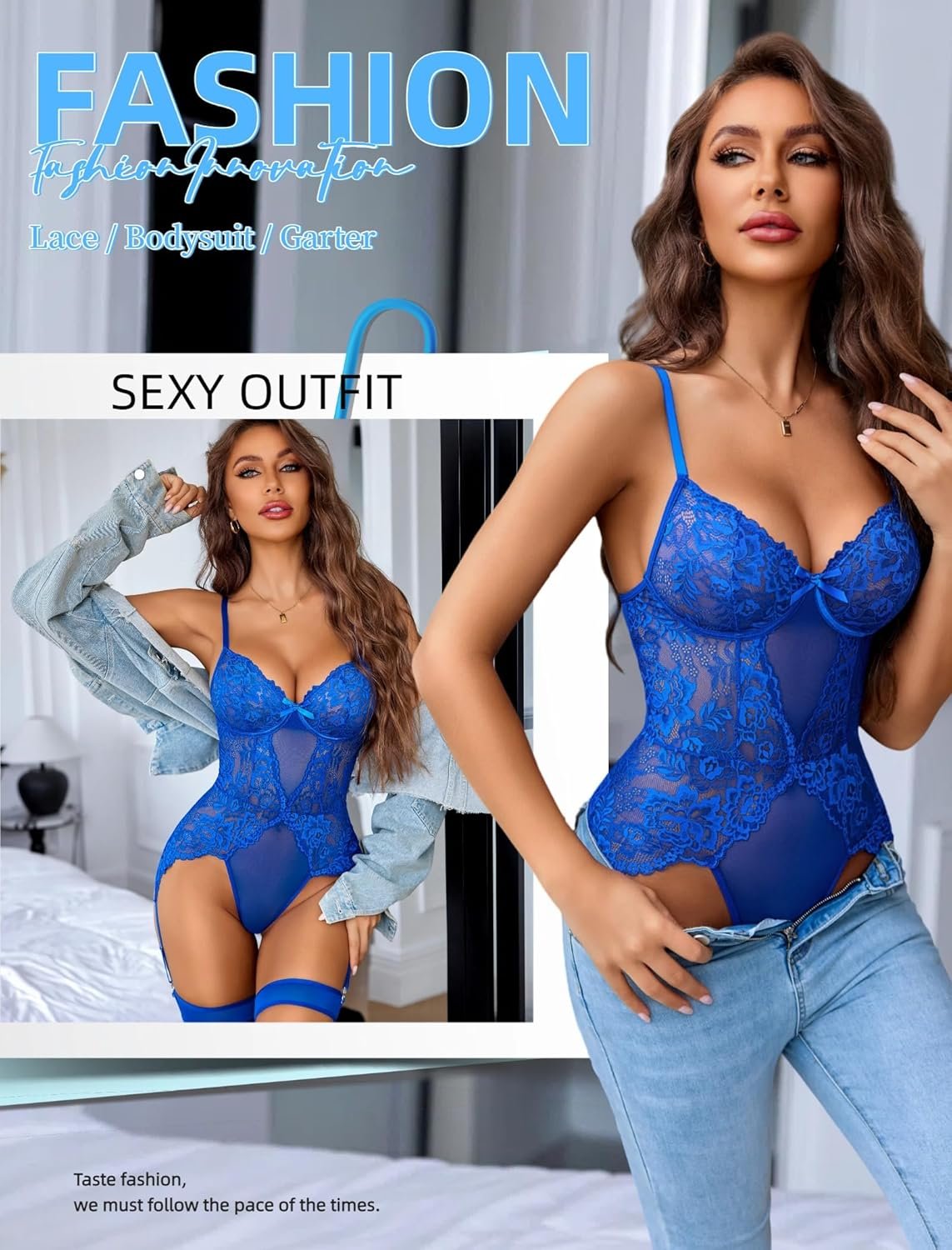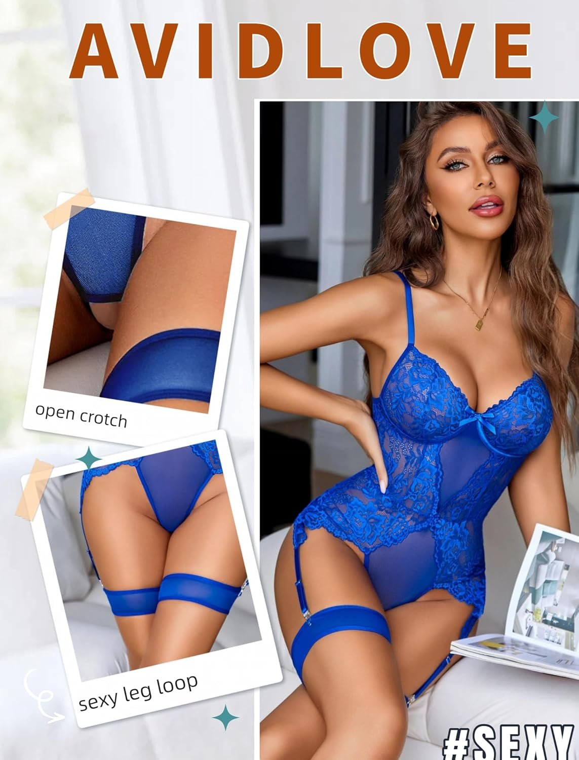 Avidlove Women Sexy Lingerie Lace Bodysuit with Garter Belt & Thigh Straps Mesh Garter Lingerie Set