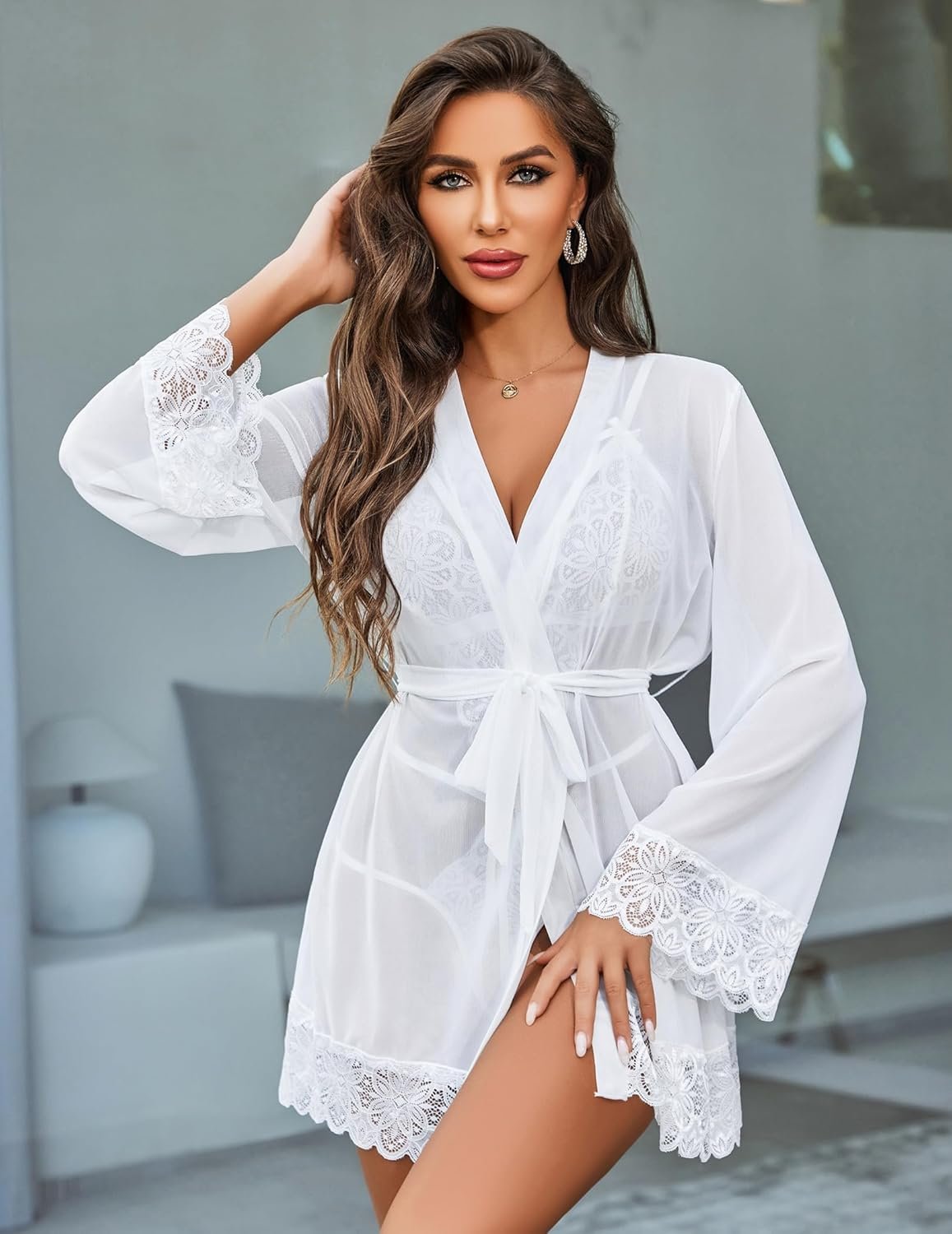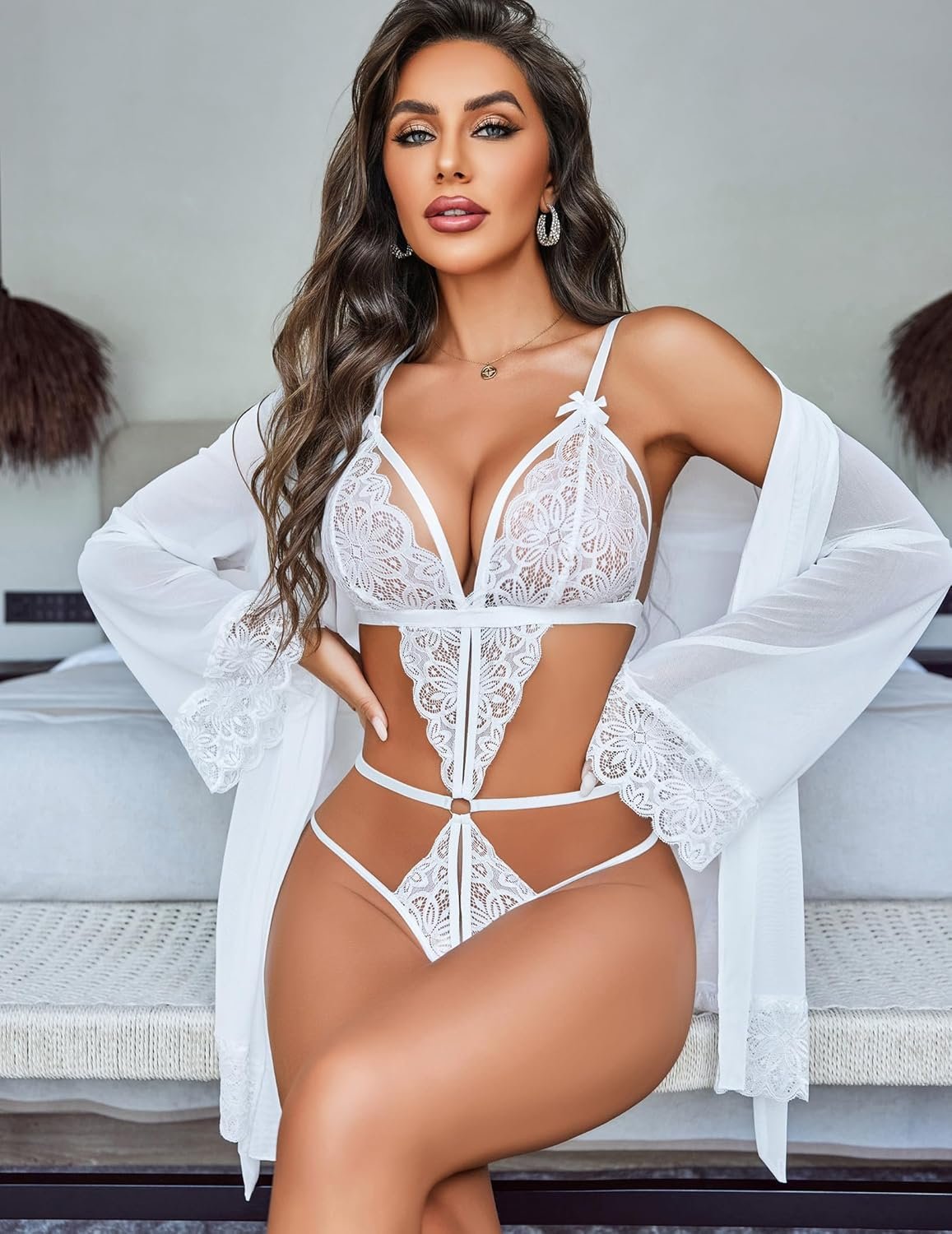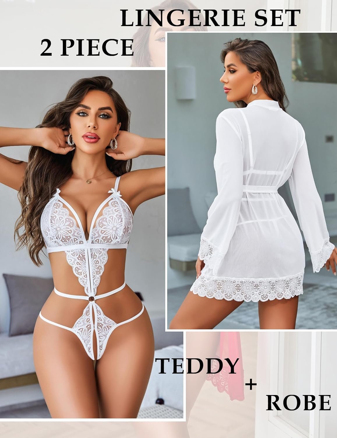 Avidlove Women Sexy Lingerie Set 2 Piece Lace Teddy with Mesh Kimono Robe Bodysuit Nightgown