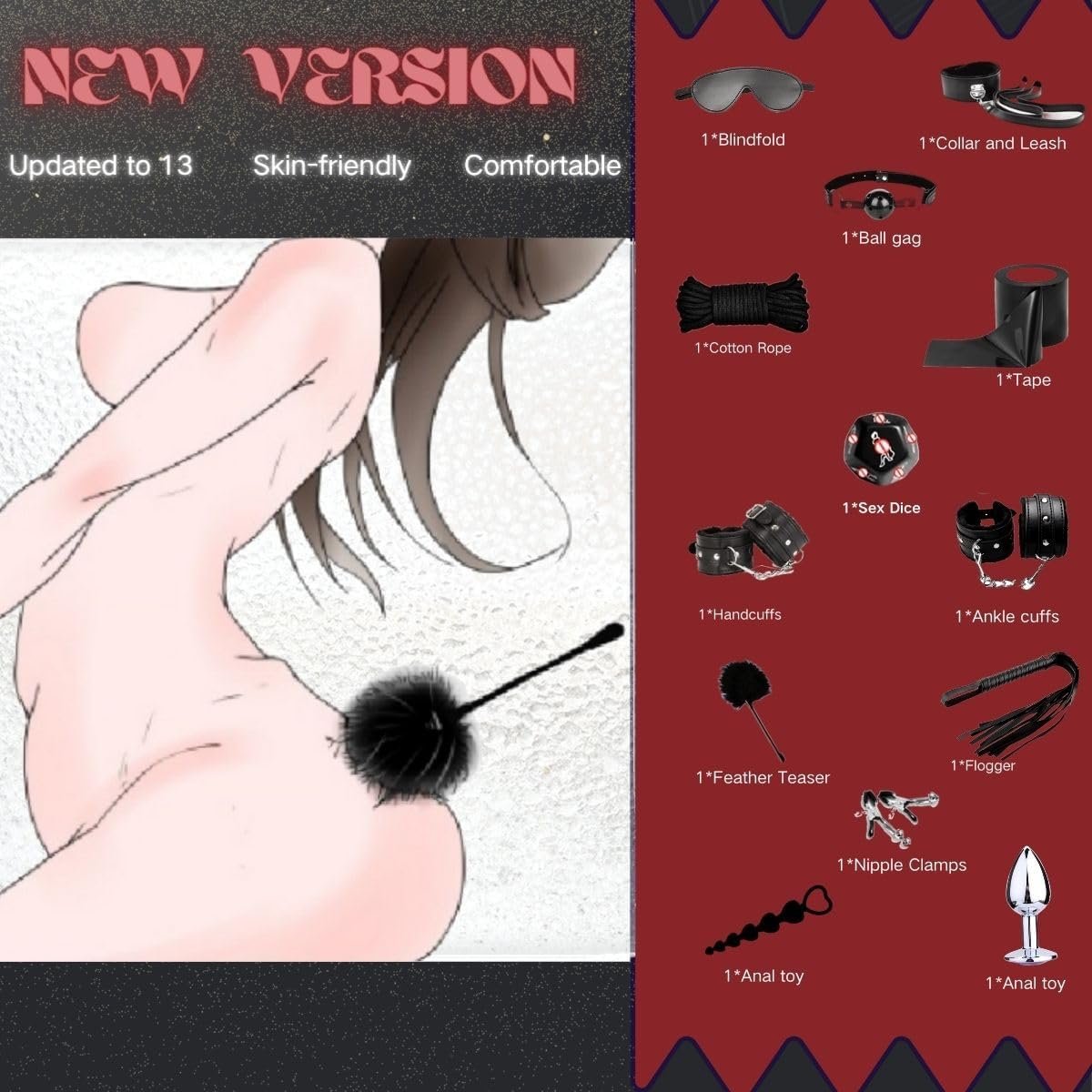 Upgraded BDSM Set :Contents include 2*Anal toys, 1*Nipple Clamps , 1*sex dice, 1*Ball gag, 1*Handcuffs, 1*Ankle cuffs, 1*Feather Teaser, 1*Blindfold, 1*Flogger, 1*Cotton Rope, 1*Collar and Leash 1*Tape