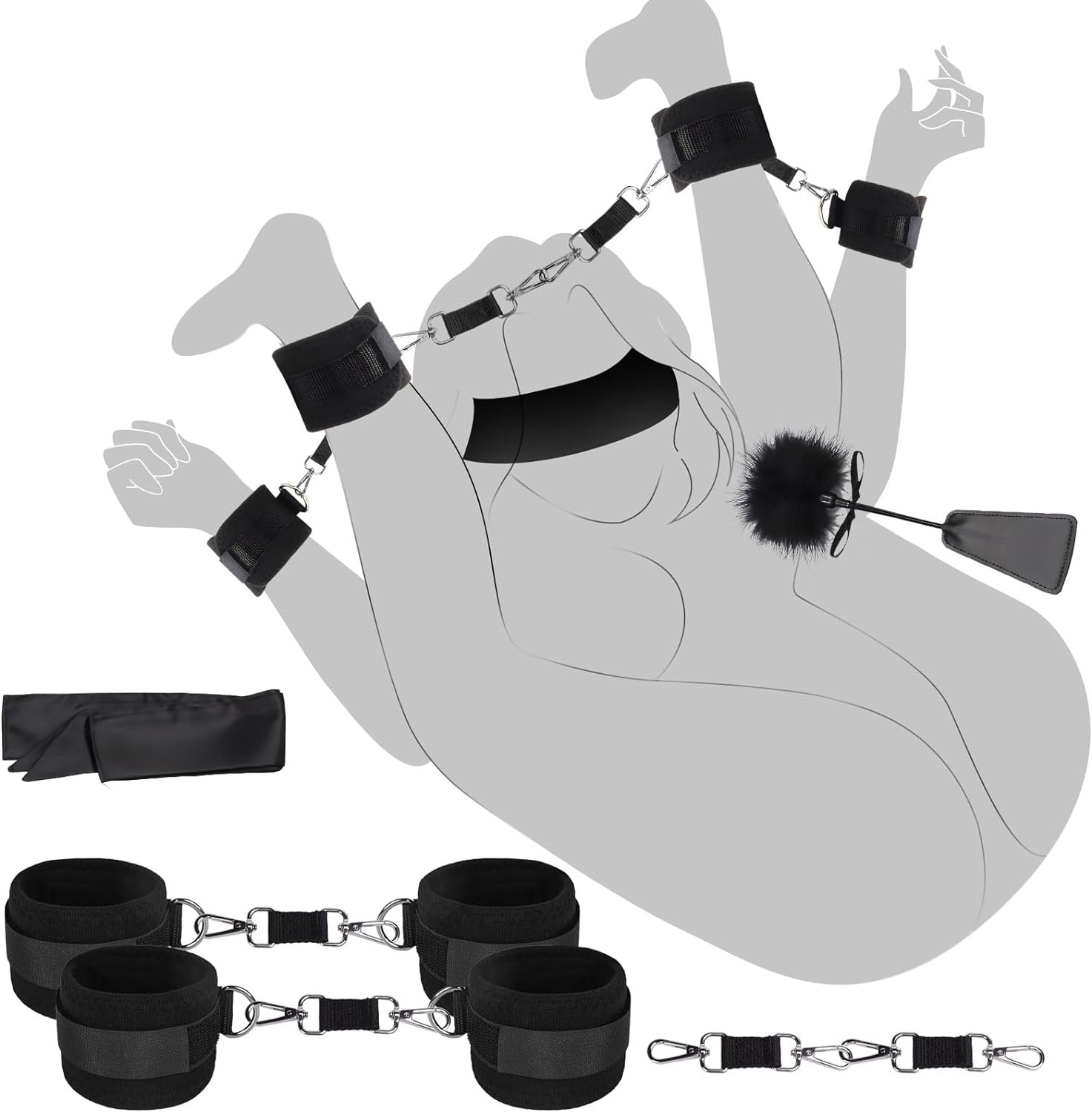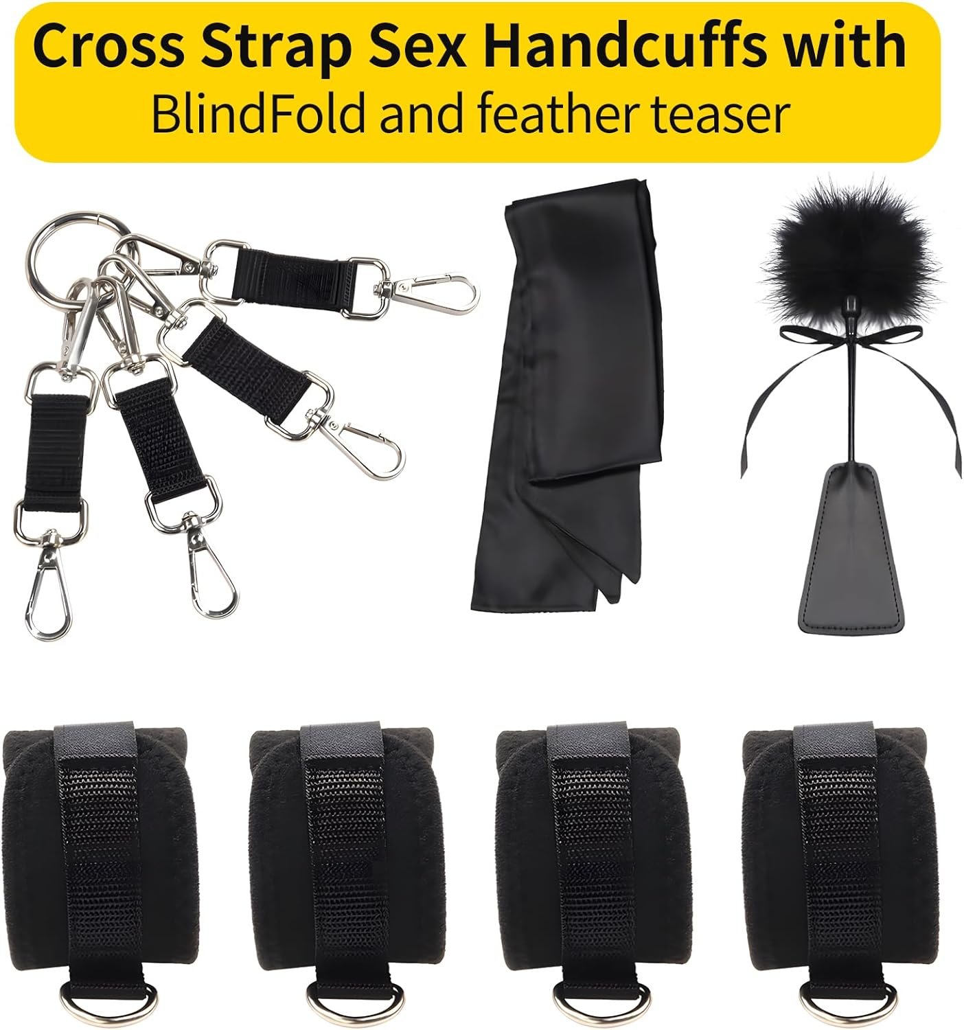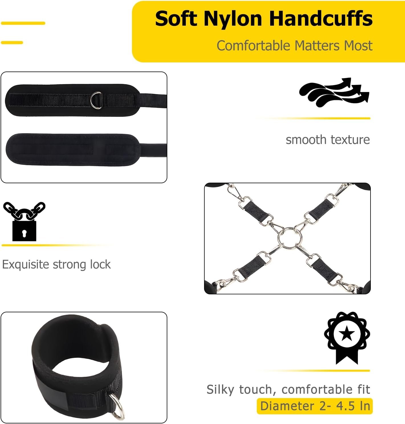 【Premium Quality Materials】Crafted from high-quality, body-safe materials, Soft and thick Nylon handcuff, Sturdy Velcro and metal connection, this bondage kit prioritizes safety and comfort. The durable yet soft straps provide a luxurious feel against the skin, enhancing the overall sensory experience during intimate moments