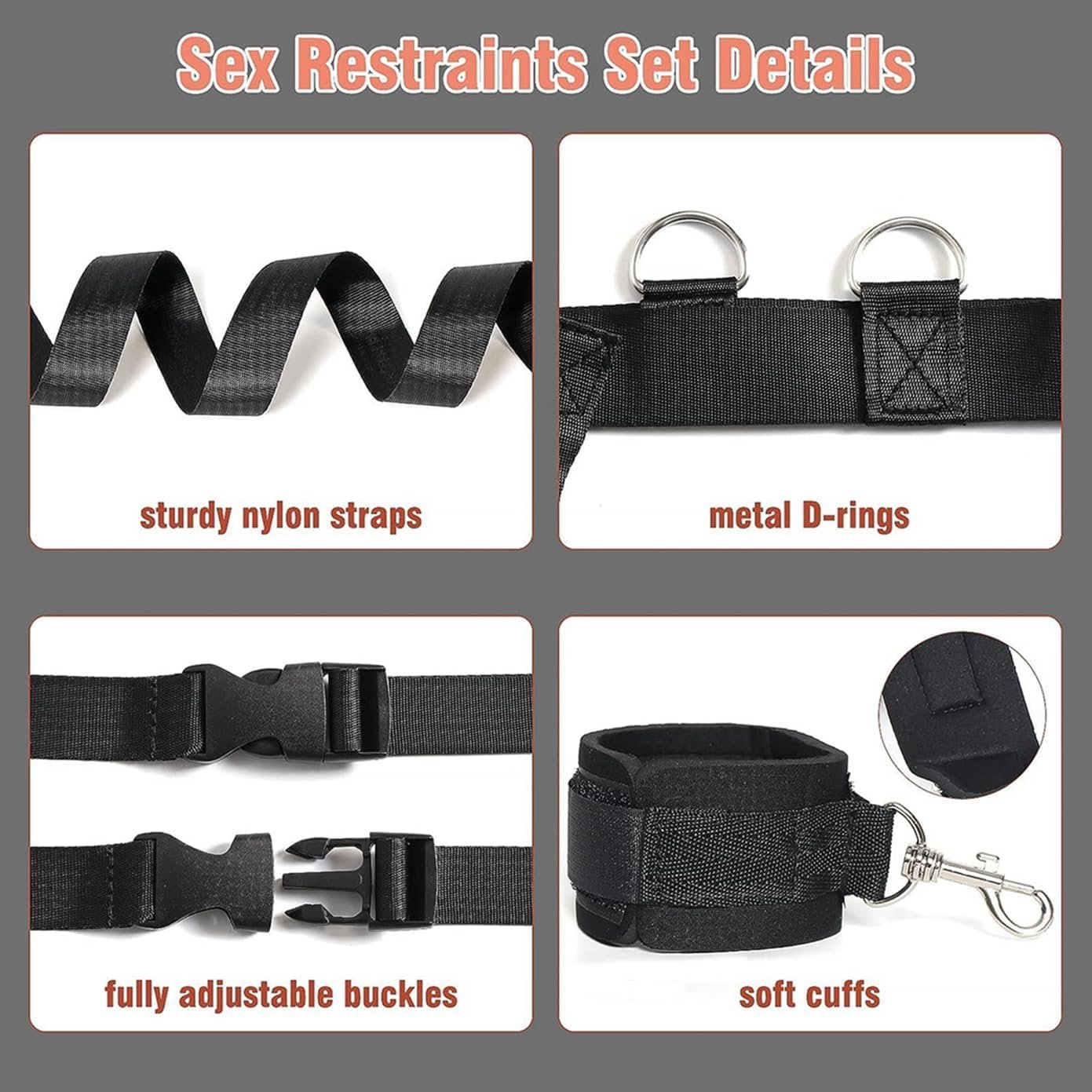 🍑【SOFT CUFFS】The 4 cuffs are separate from the bed restraint kit, they can simply be replaced with a carabiner. There are 12 secure tie points (metal D-rings) for your cuffs. Smooth fabric that lines the insides of the cuffs, that feel soft and very comfortable on your bare wrists and ankles. Sexy sex handcuffs hand cuff bracelets for women couples
