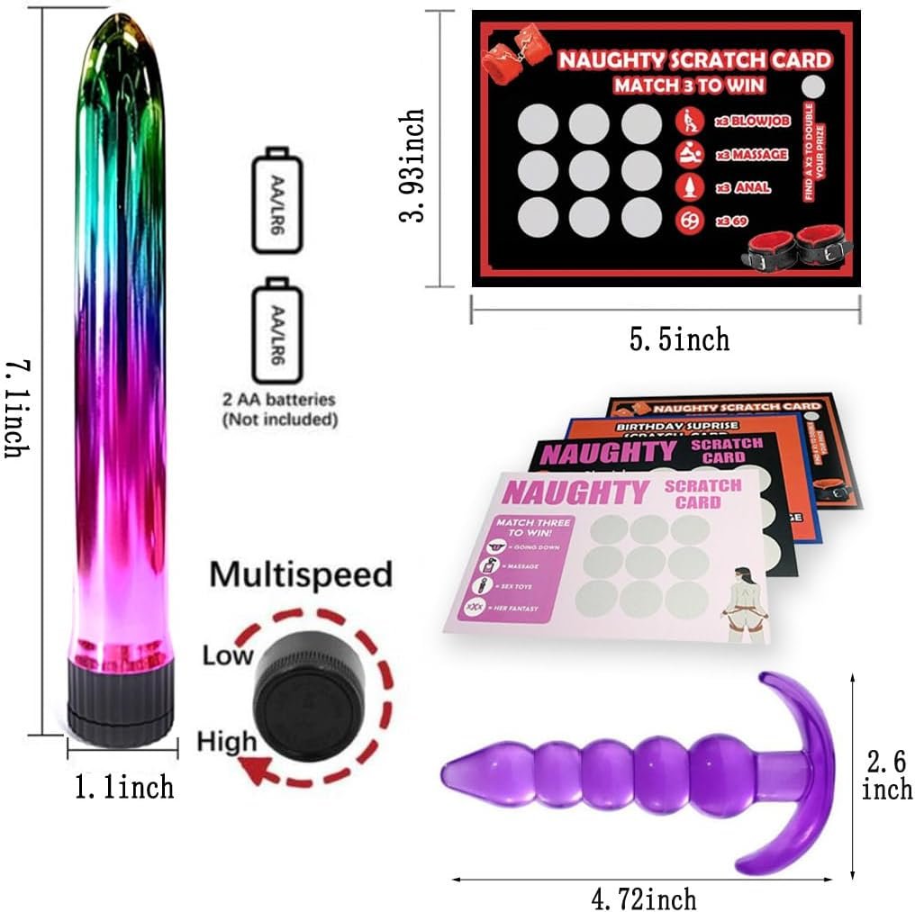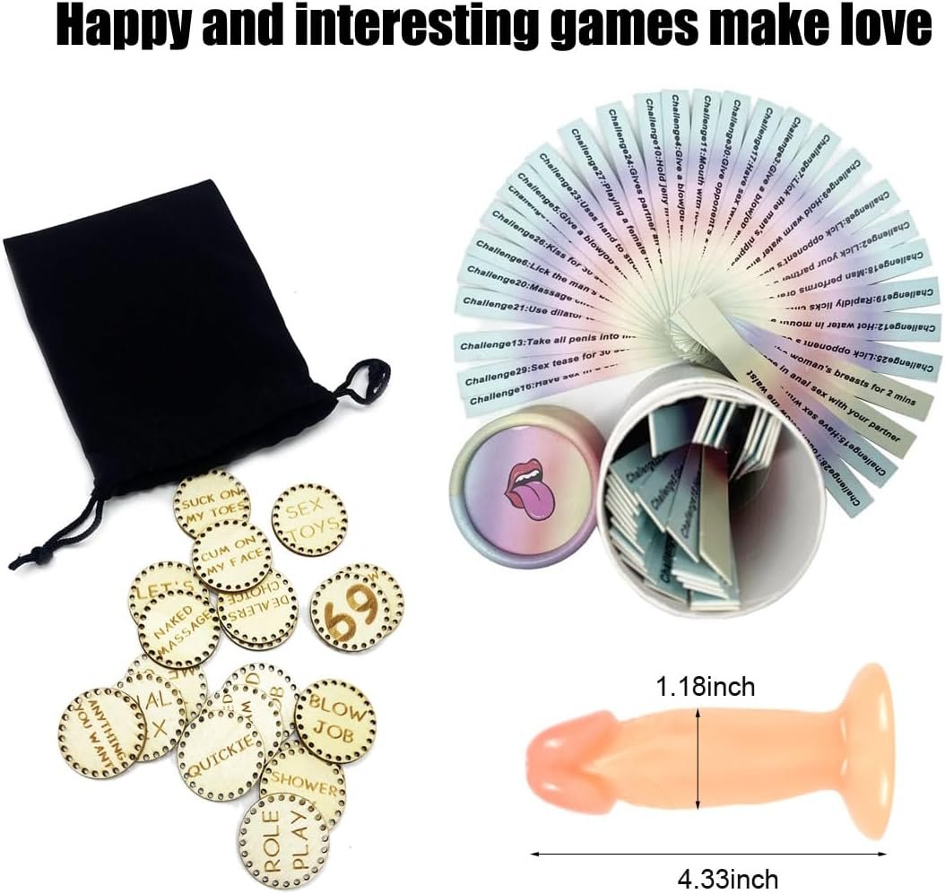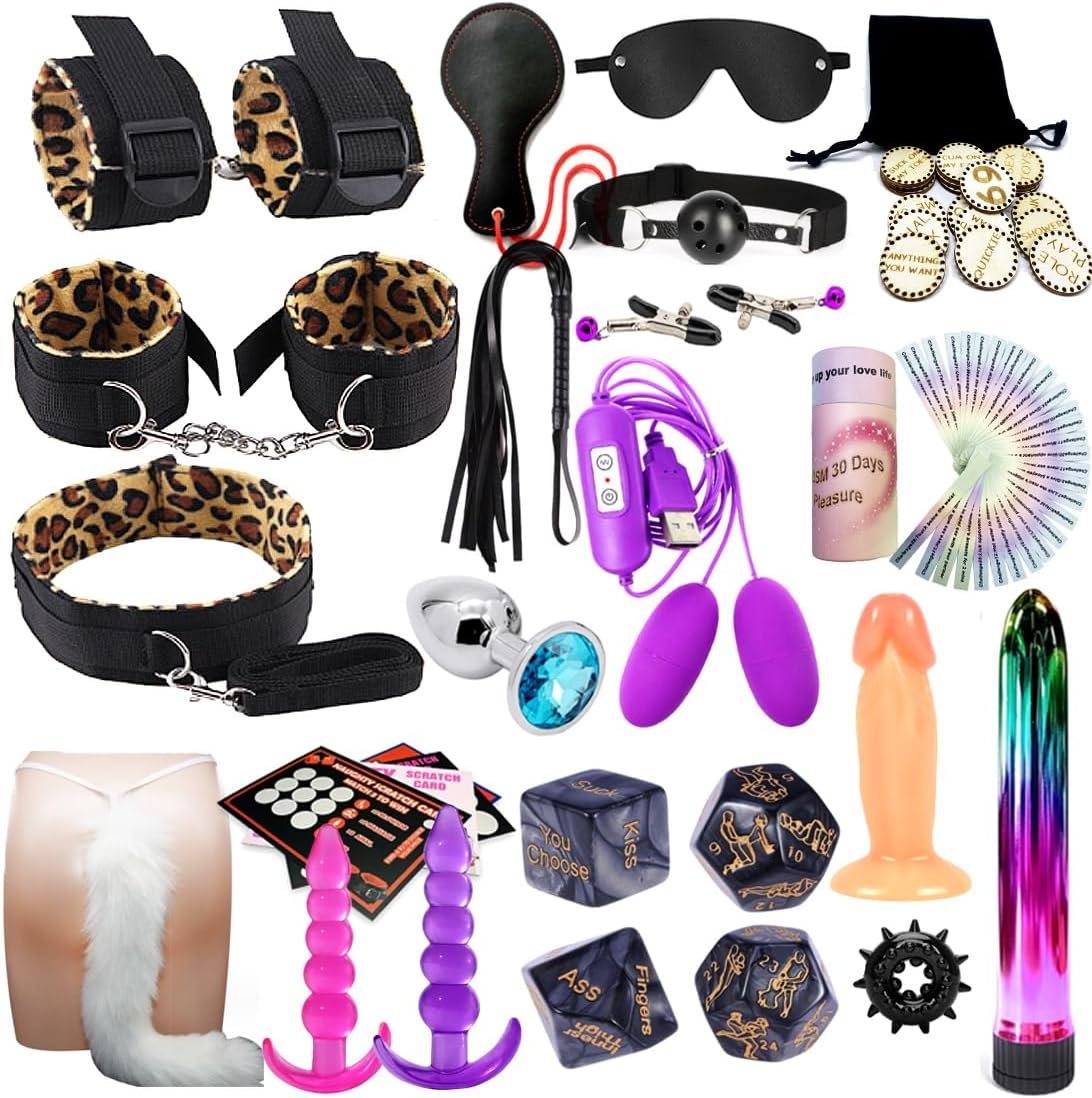 Bondage restraint set: adjustable handcuffs x2, adjustable Ankle Shackles x2, sex dice x4, nipple clip x2, adjustable collar+drawstring x1, eye mask x1, spanking paddle x1, stainless steel anal plug x1, Dildox1, Silicone anal plug x2, Scratch Cards*4, Sex stick x1, Cock ring x1, Underpants Featherx1, Tokensx1, Flirt stick/eggx2, Whipx1.
