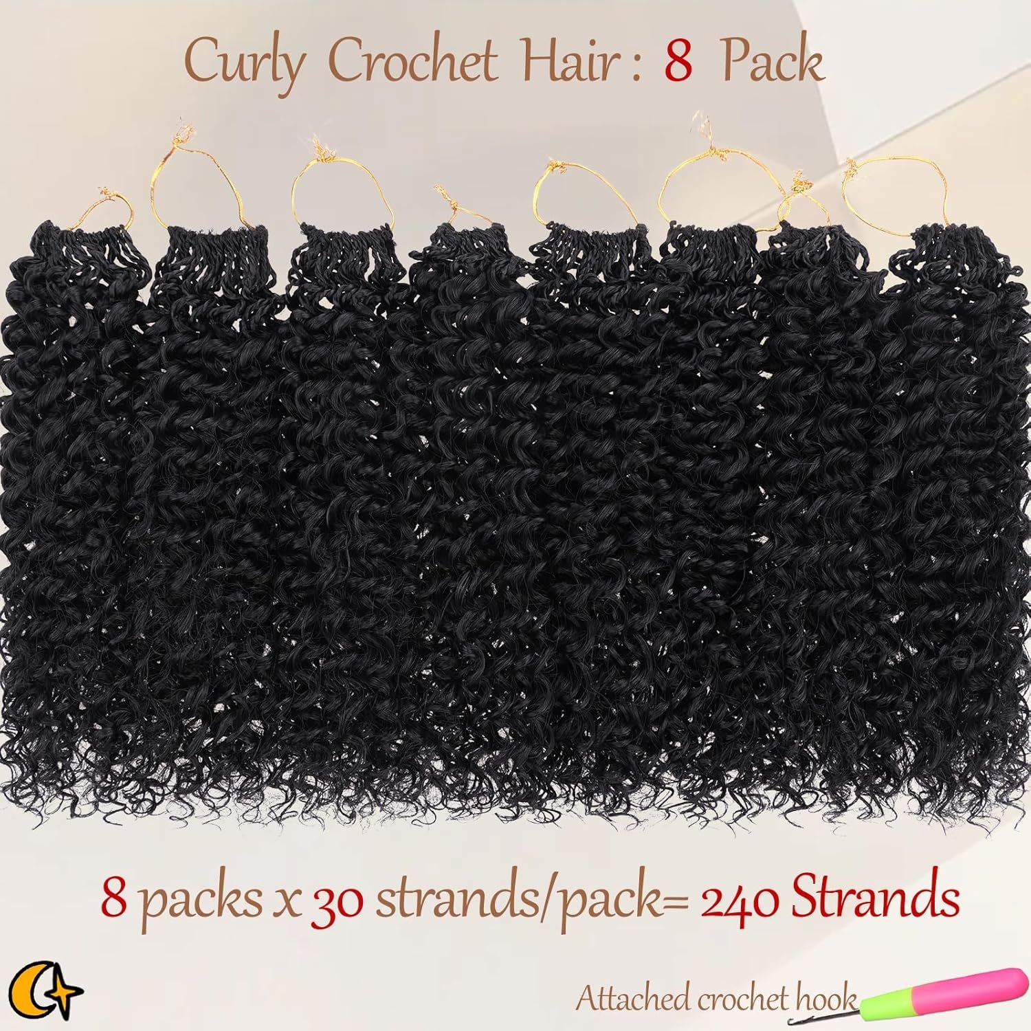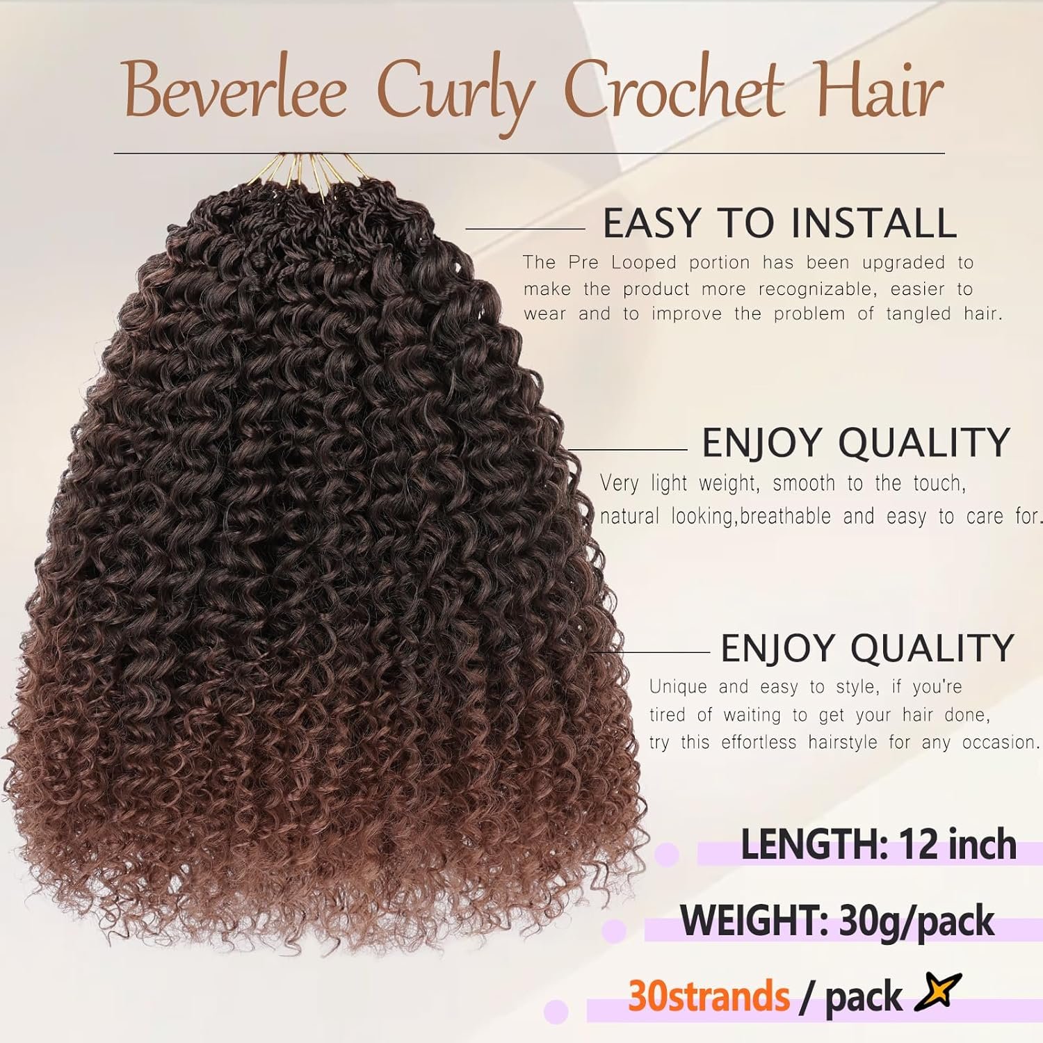 『Crochet Hair Pre Looped Specification』30 strands/pack, 8 packs/Lot. The length is 12 Inches, usually 6-8 packs can fill a head. The curls are available in a variety of colors, and the look itself has a casual vibe that makes you look approachable and glamorous