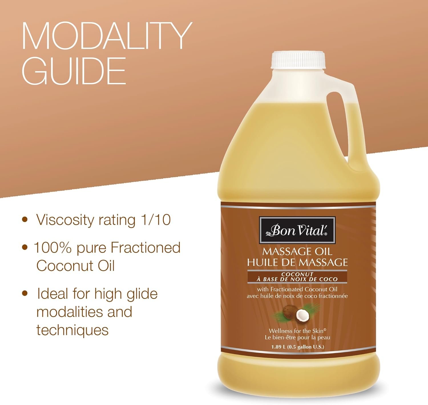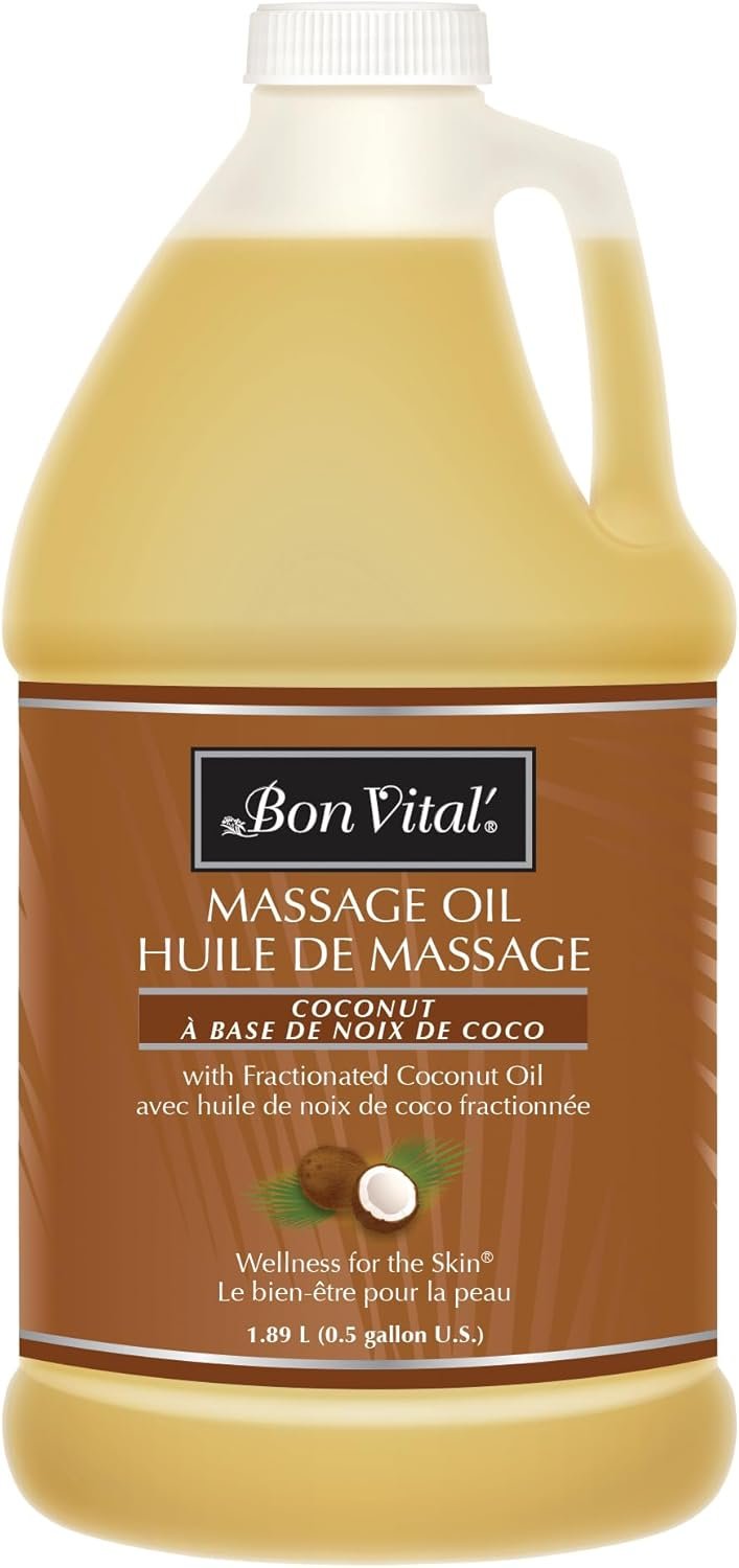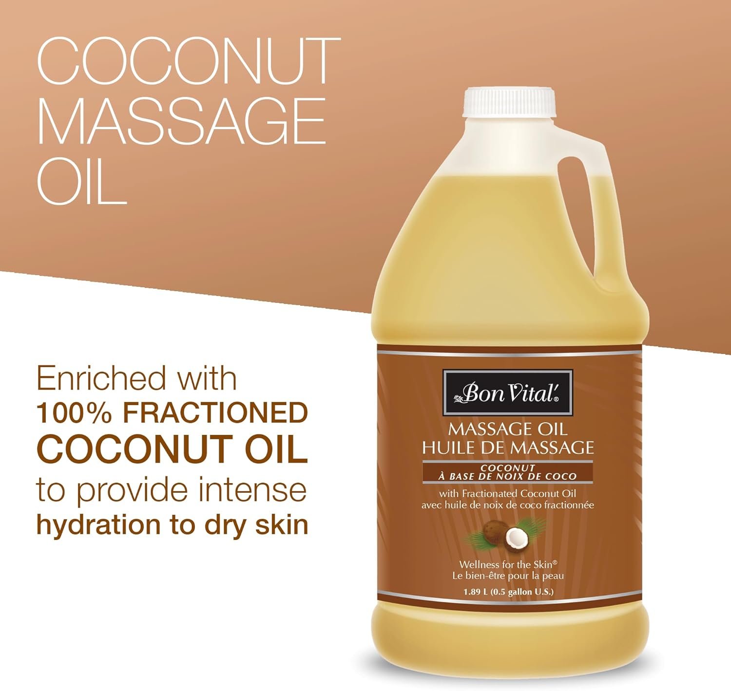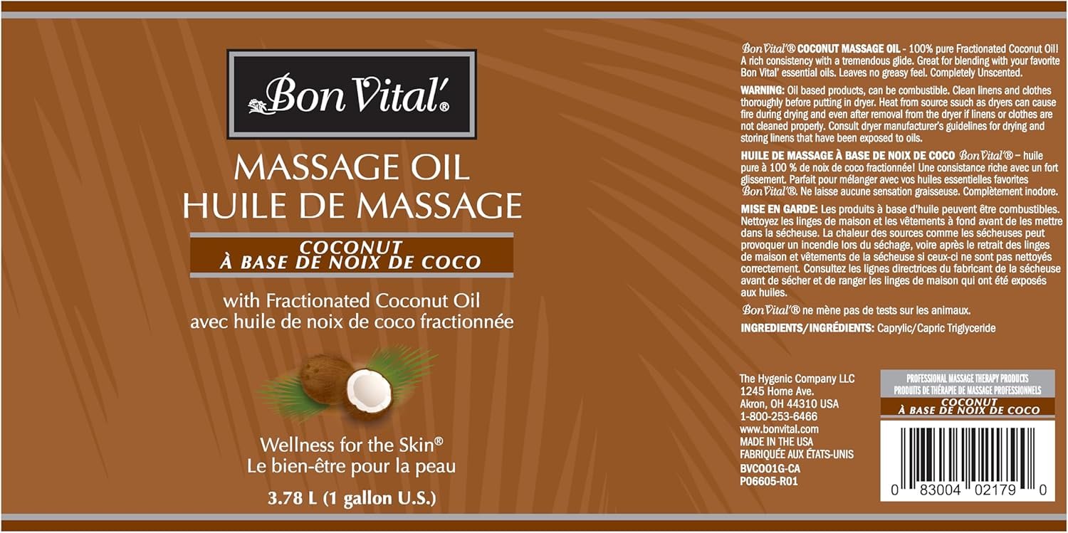 Bon Vital’ Coconut Massage Oil with 100% Pure Fractionated Coconut Oil to Repair Dry Skin, Used by Massage Therapists and At-Home Use for Therapeutic Massages and Relaxation, 1 Gal, Label may Vary