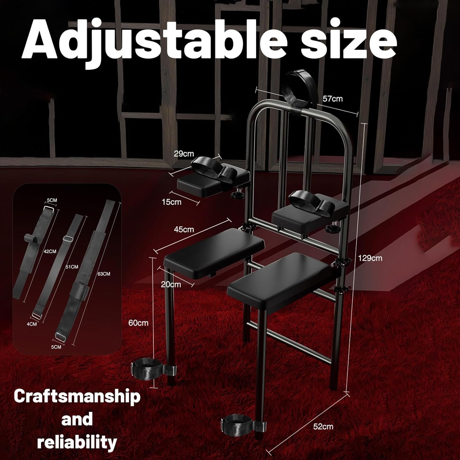 Novelty BDSM Sex Toy: brand new ways of playing with multiple postures. This product includes handcuffs, leg cuffs, neck cuffs and an adjustable seat, which makes adult games more interesting.
