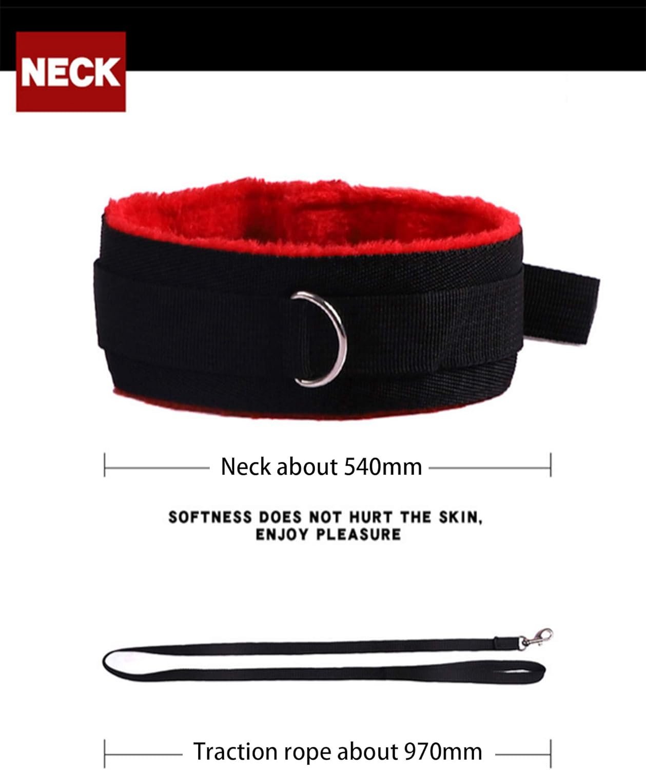 1.The bondage kit includes bondage rope, bsdm collar, ball-gag, nipple clamp, 2 pairs handcuffs for sex play, light soft sexy eyepatch, black whips for sex, those bed restraints are adjustable, so it can fit almost all people size.