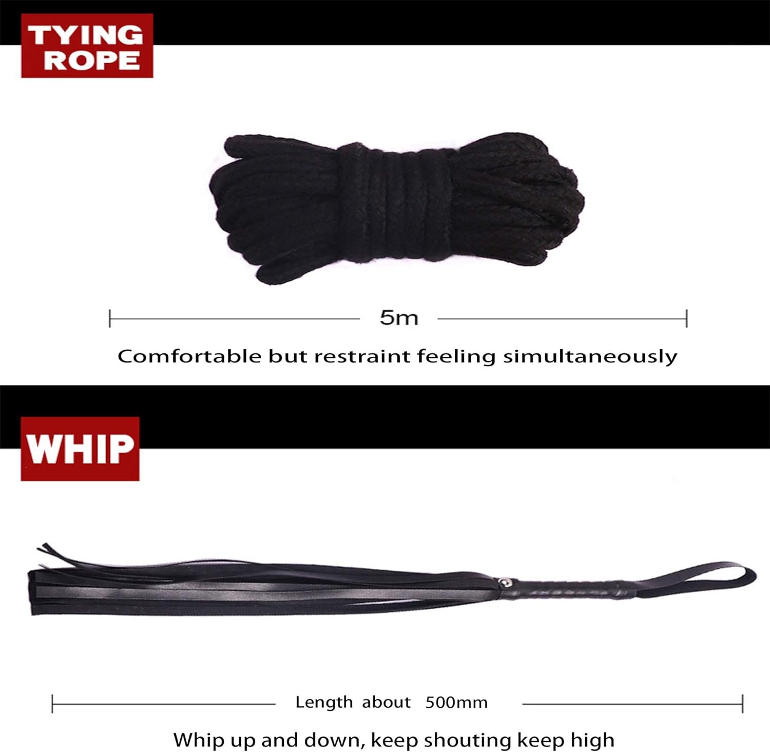 Product name: adult game couples sex set bdsm restraints kit adult toys for couples sex bondage kits/SM set Bandage kits sex for couples includes: slave collar(bdsm collar), nipple clips, bdsm rope(cotton rope, black rope), wrist cuffs, mouth gag, light eyepatch, black whip.