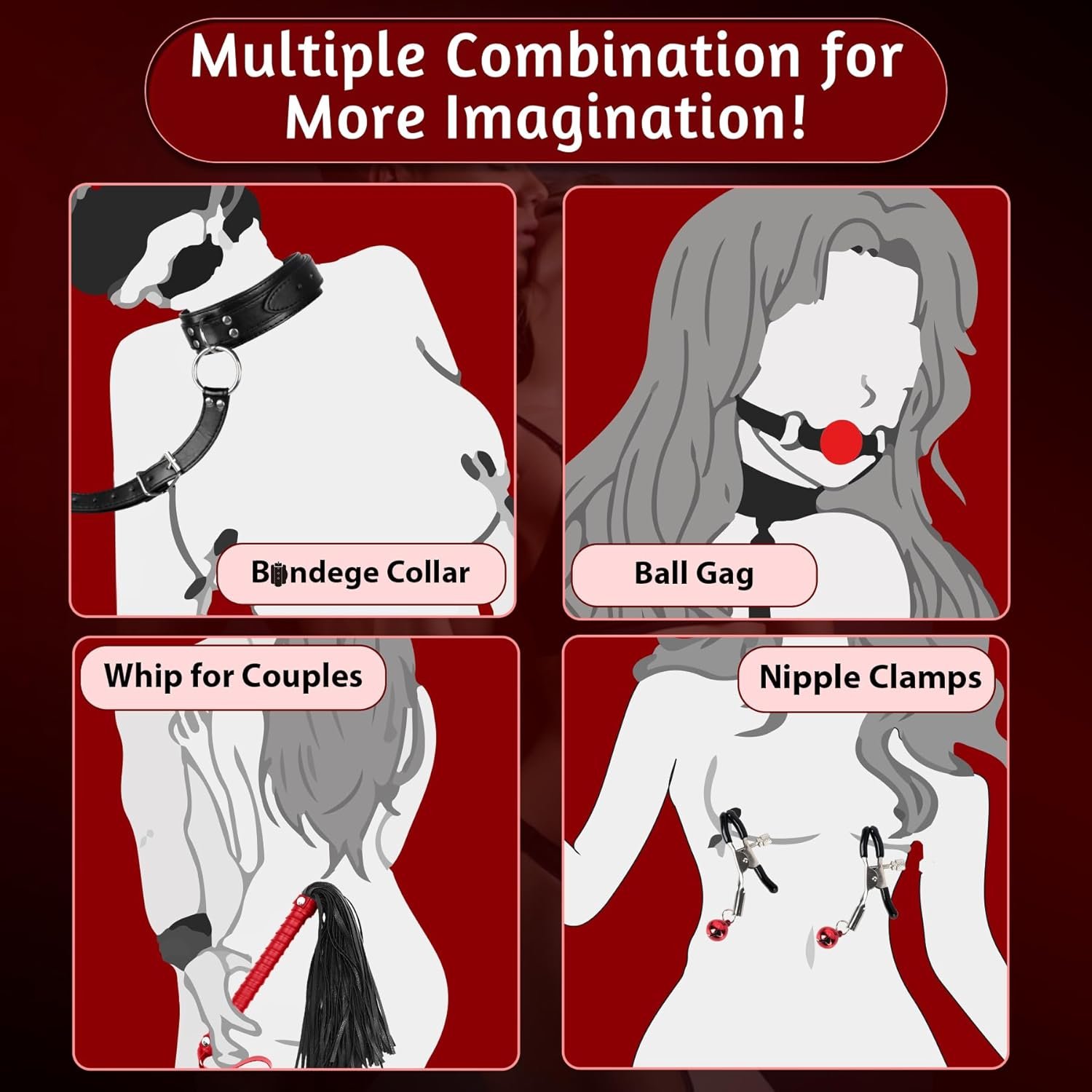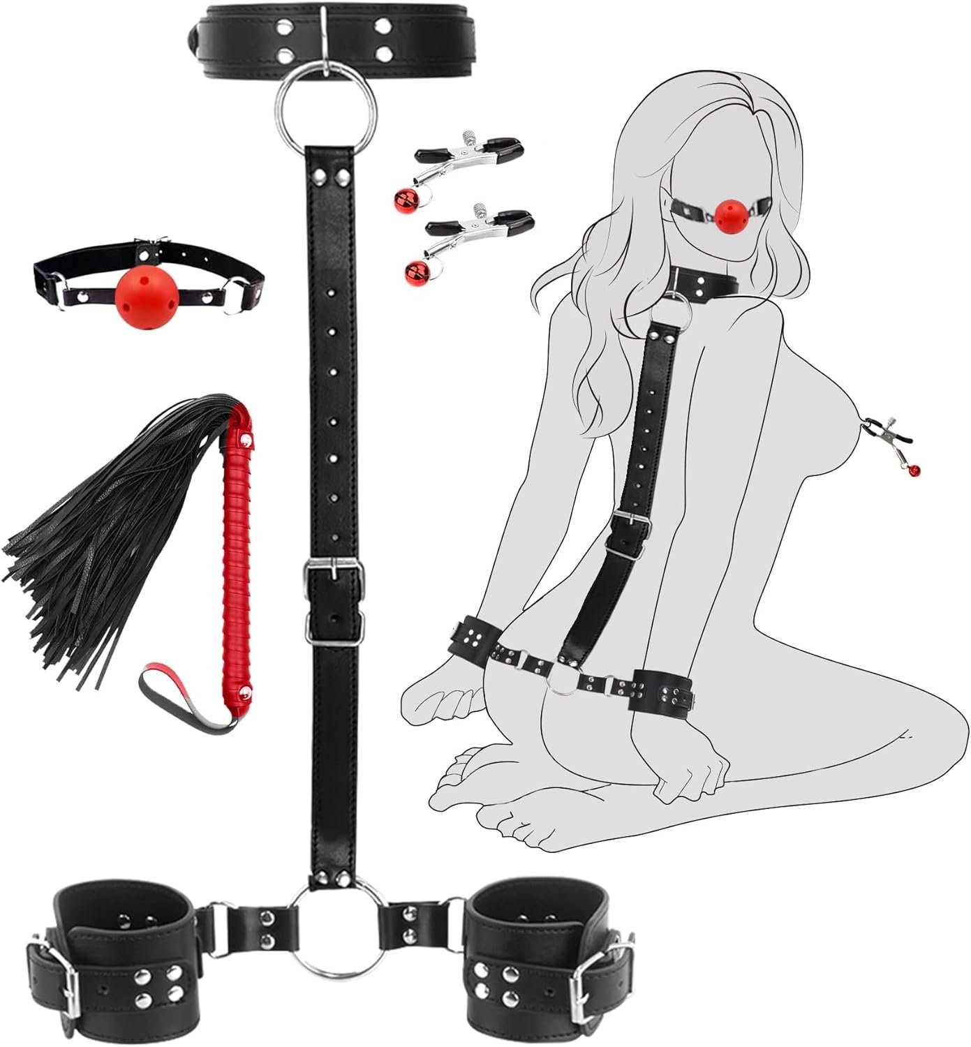 Bondage Gear Accessories Restraints Set: The sex restraint with a set of adjustable neck-to-wrist handcuffs, a ball gag, a leather whip, and nipple clamps. Whether for solo play or with a partner, this bondage kit guarantees to meet your diverse needs