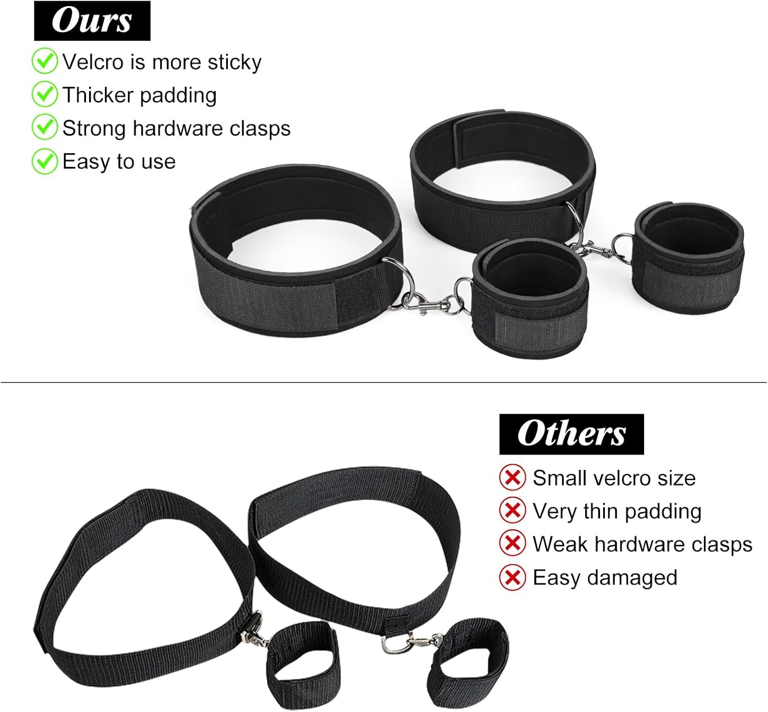 【Comfortable&Durable】 The bondage straps is made of soft cotton-pad-Velcro, the wrist and thigh feel soft and comfortable when you use it. After many tear tests, the Velcro will stick tightly to the strap. Doesn’t fall off easily even when used violently. You and your partner can enjoy the different sensations when changing positions while using this bondage straps.