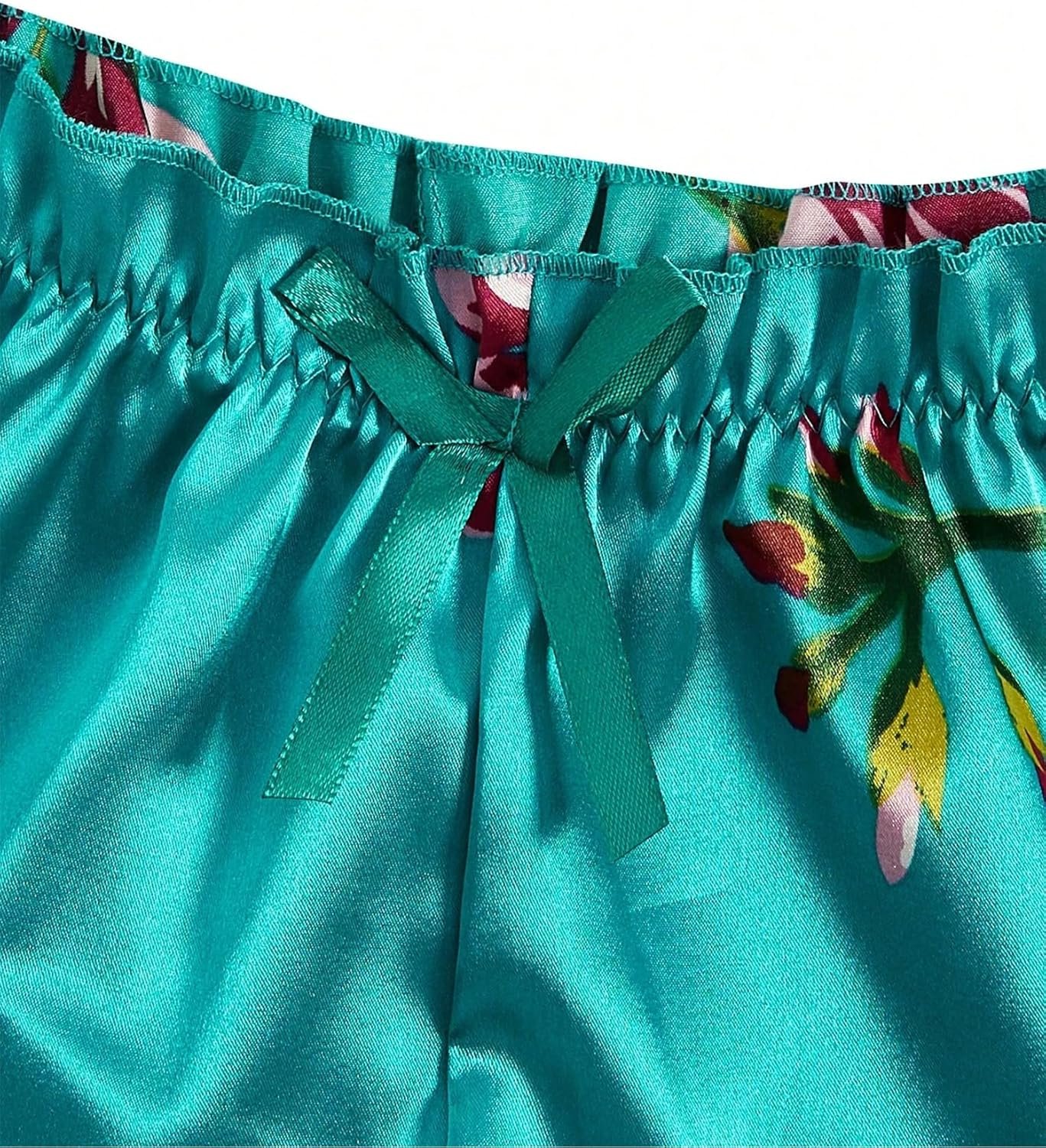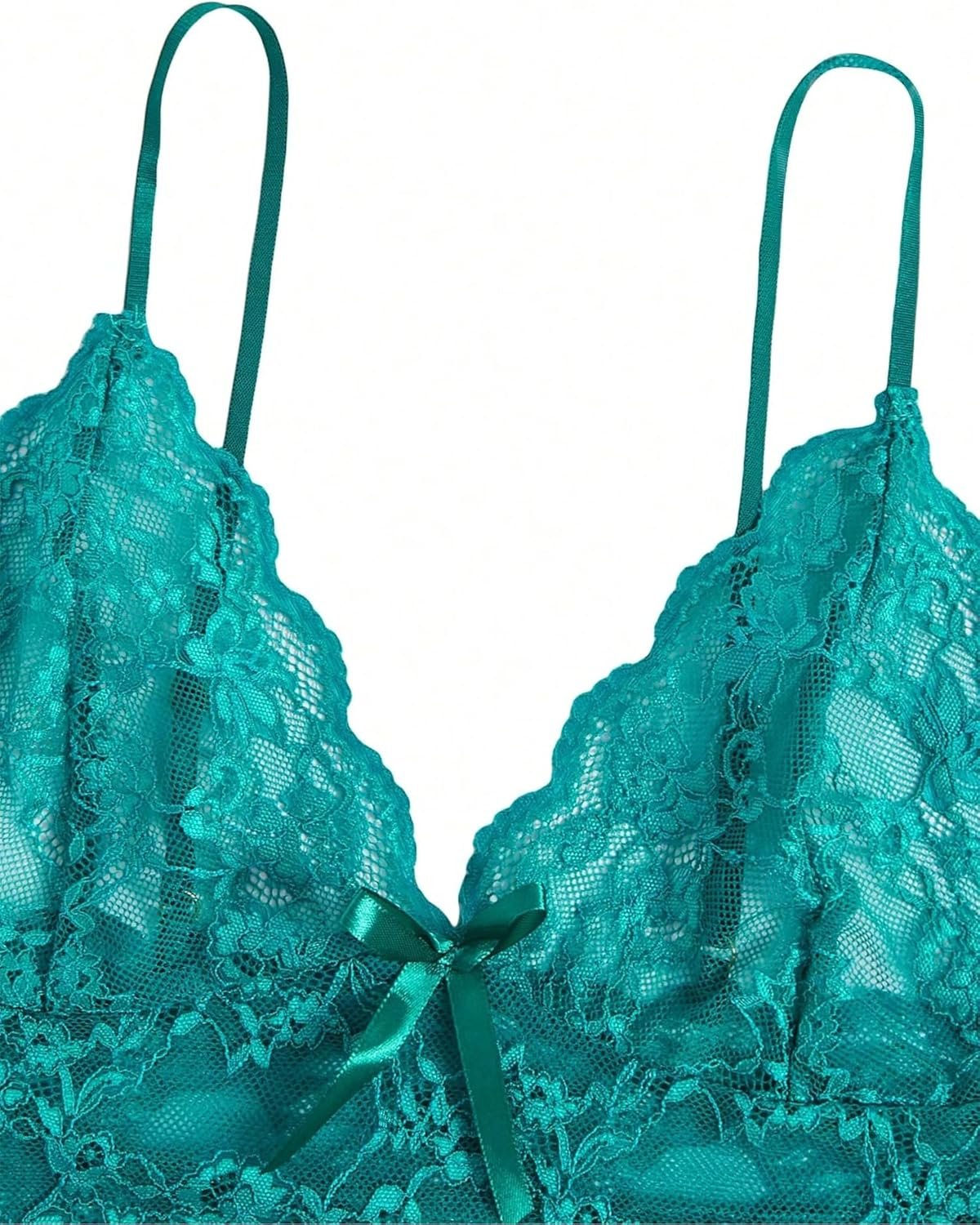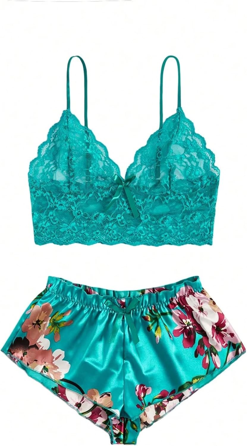 Bow Lingerie For Women Sexy Floral Lingerie Plus Size Lace Bra And Panty Set V Neck Lace Top Cami Shorts S-XXL
