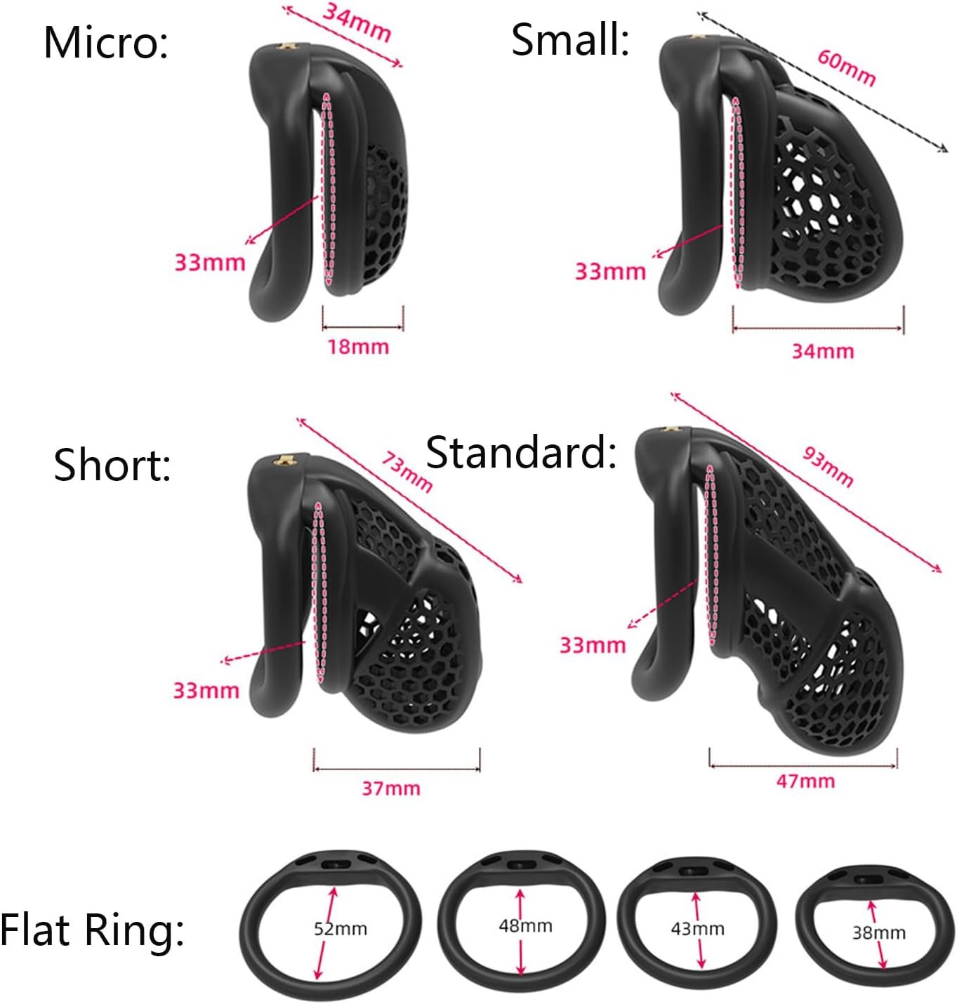 Reasonable Size:The chastity cage has 4 lengths for your choice-34mm/1.33in, 60mm/2.36in, 73mm/2.87in, 93mm/3.66in/. 4 carabiners measure 38mm/1.49in, 43mm/1.69in, 48mm/1.88in, 52mm/2.04in.