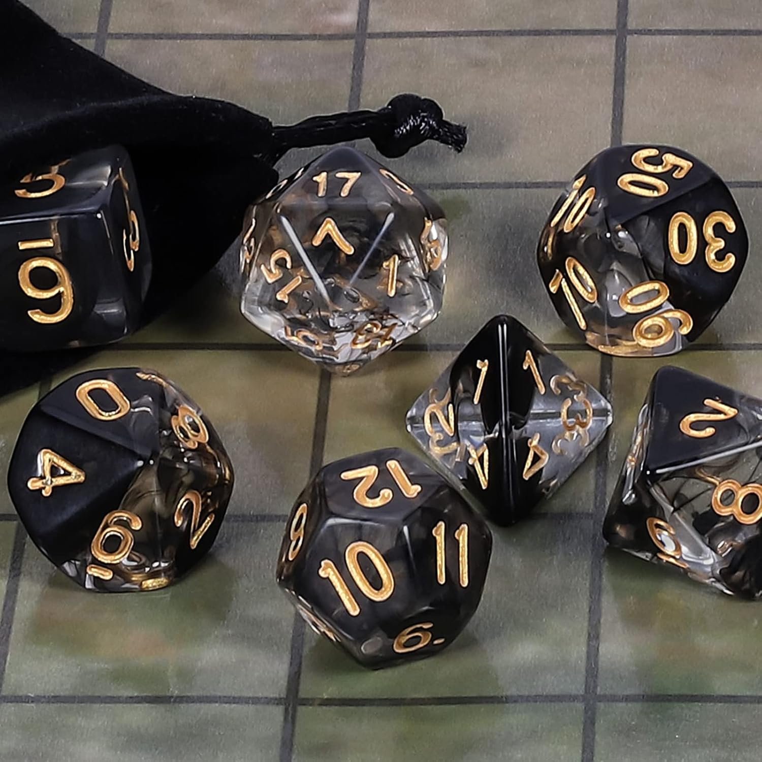 🎲 7pcs Polyhedral dice set: Contains one d20, one d12, two d10 (00-90 and 0-9), one d8, one d6 and one d4 and a velvet dice bag.