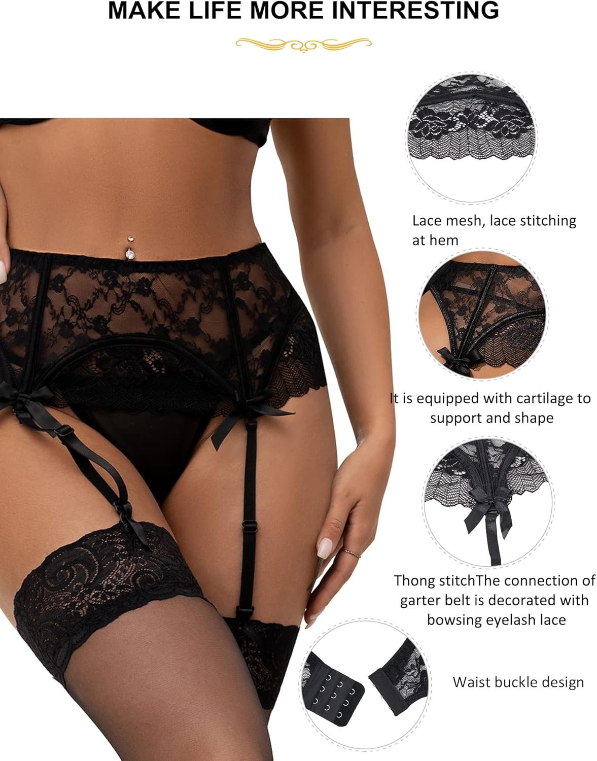 comeondear Eyelash Lace Garter Belts with G-String for Thigh Highs Plus Size Black Garter Lingerie for Women