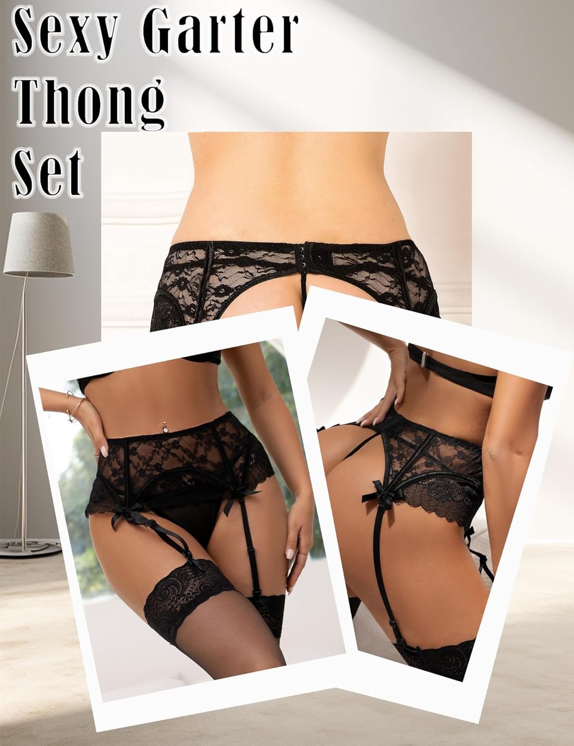 Garter Belt Plus Size Lace Women 4 Strap with G-String for Thigh Highs Black Lingerie for Women
