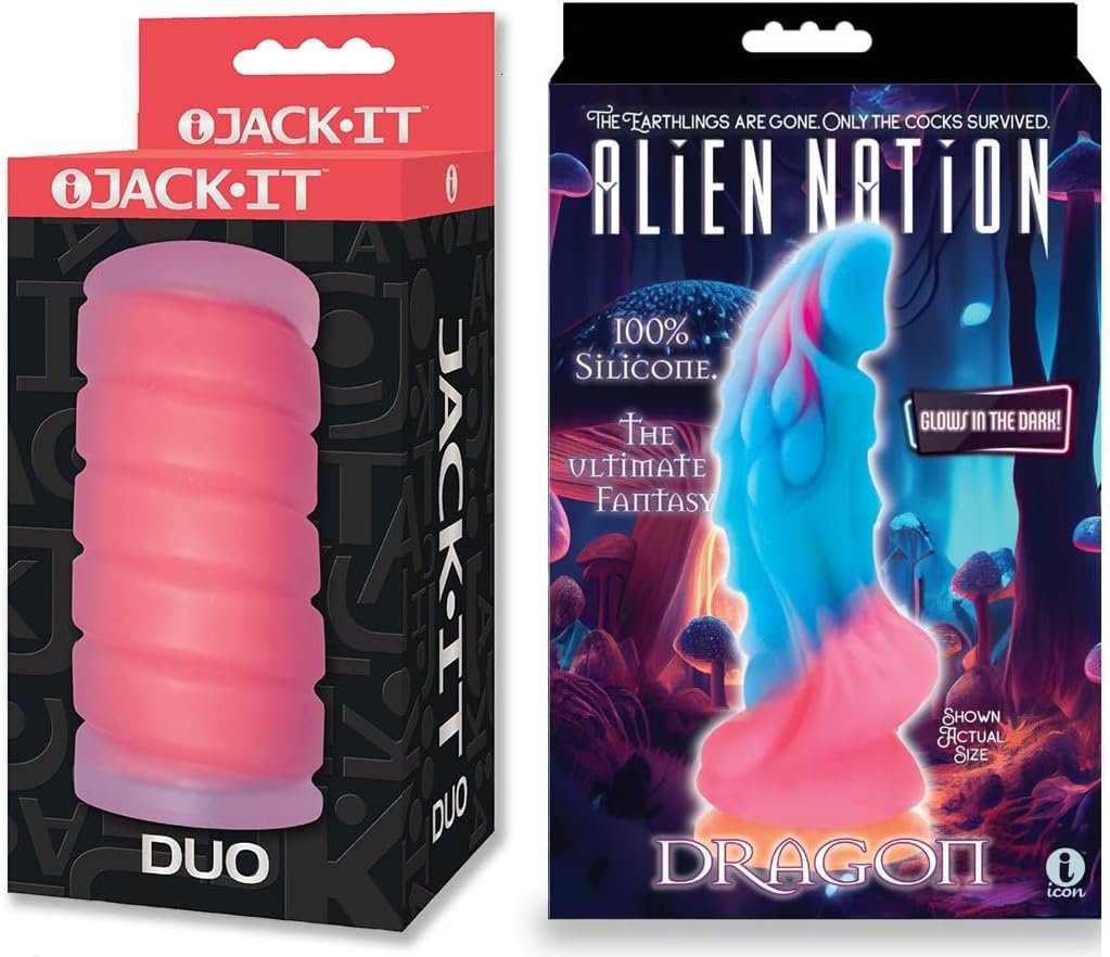 Couples Sex Toy Bundle of Jack-It Duo, Cherry and Icon Brands Alien Nation Glow Dragon Silicone Glow in The Dark Creature Dildo – Multicolor
