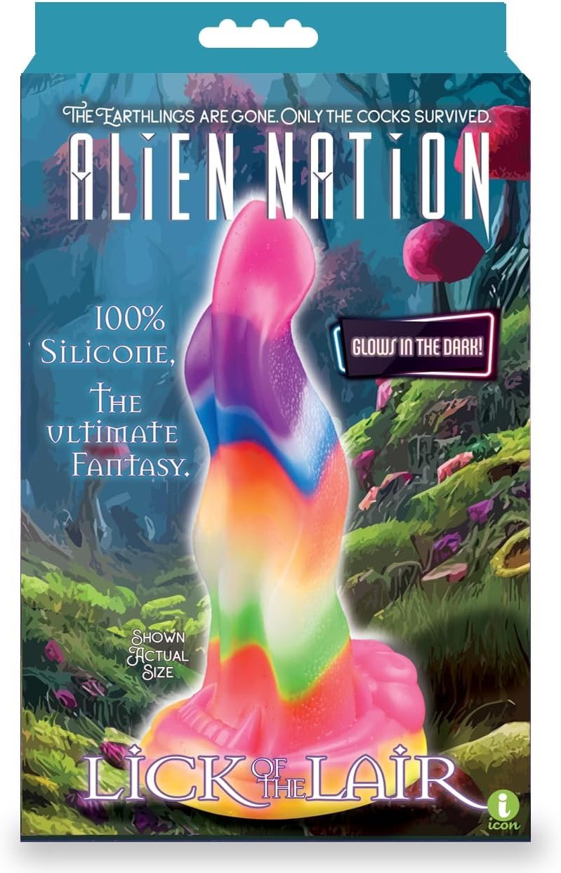 The AlienNation Story: After Earth was struck by a ten-mile wide asteroid, a sixth mass extinction event occurred, ending human civilization as we know it. What life remained would be impacted as never before…for carried inside the meteor’s core was a primordial, regenerative being, a billion years old, known as Primus.And soon Primus would change everything, into nothing ever seen: from beasts to buildings, from the fly to the sky, an Alien Nation was born. The “Lick of the Lair” Story: Even in the dangerous new world, the wolf held a fearsome spot atop the mutant hierarchy. It is said that when the lair of the arctic white was visited by a unicorn, rather than cower at its growl, she touched its tongue, giving it the gift of glow! “The Lick of the Lair” would come to mean good fortune, and the tongue of “The Lick” would come to glow in the dark, in a virtual rainbow of erotic colors!