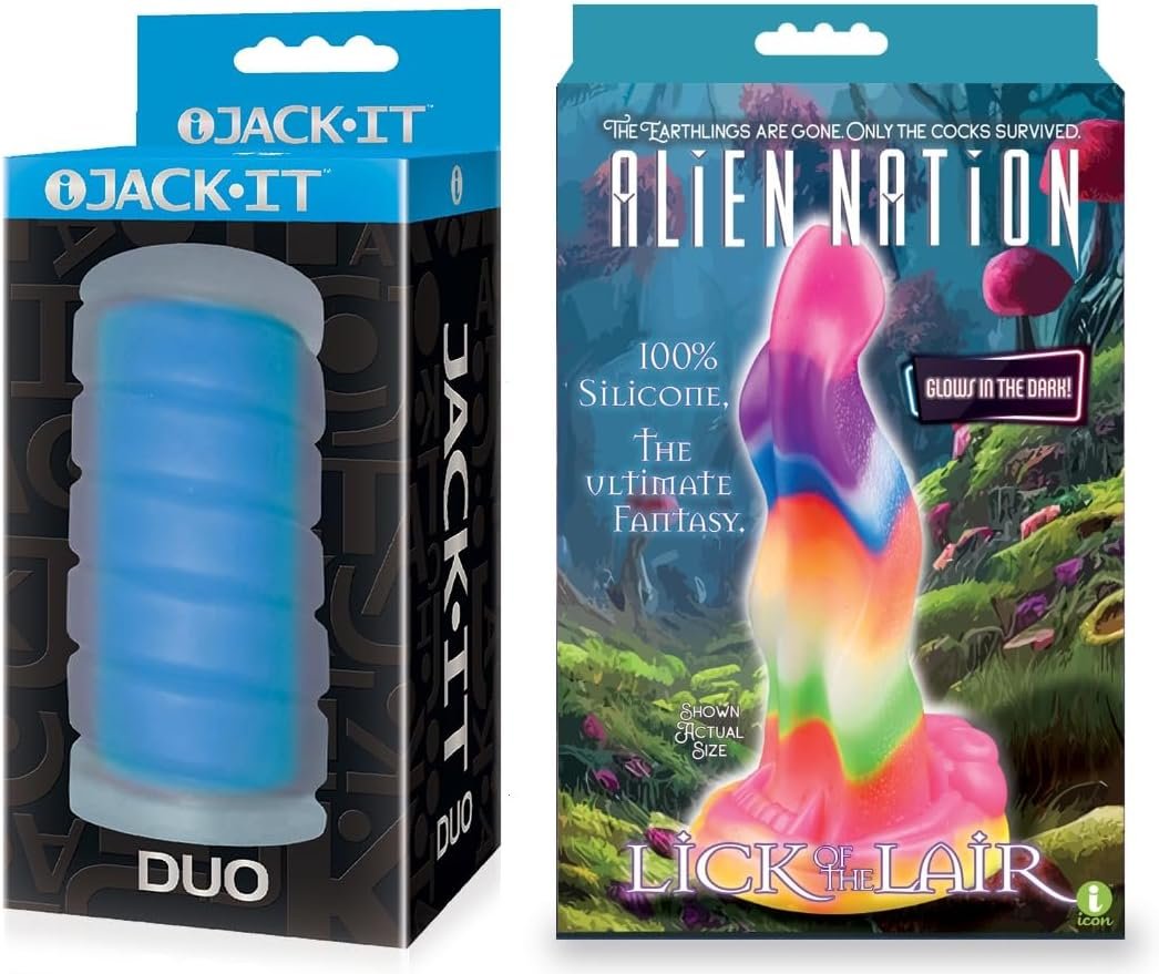 Couples Sex Toy Bundle of Jack-It Duo, Sky Blue and Icon Brands Alien Nation Lick of The Lair Silicone Glow in The Dark Creature Dildo – Multicolor