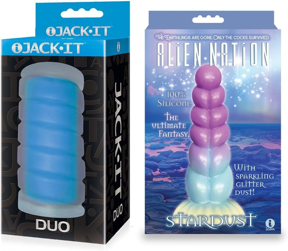 Couples Sex Toy Bundle of Jack-It Duo, Sky Blue and Icon Brands AlienNation Stardust Silicone Creature Dildo – Multicolor