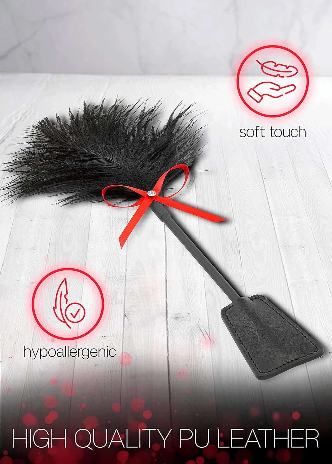 (Material) Tickling feathers are made of a very soft material that is high quality and gentle on the skin. The ergonomic shaft and the tightly mounted leather flapper make it comfortable to use.
