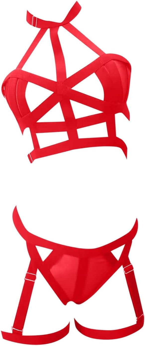 Curvy Lady’s Strappy Lingerie For Women, Plus Size Exotic Garter Thong, BBW Halter Gifts For Him 3 Piece Garter Lingerie Set