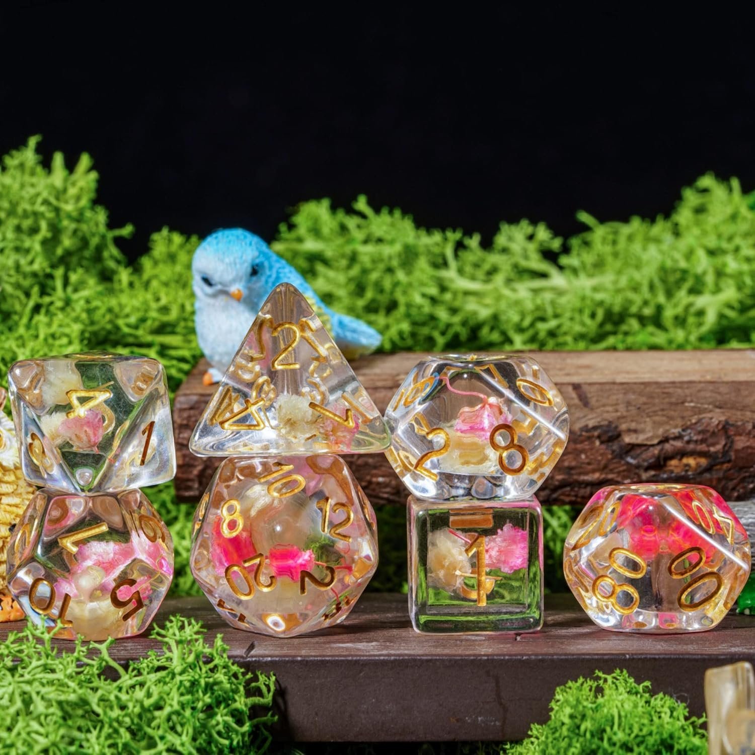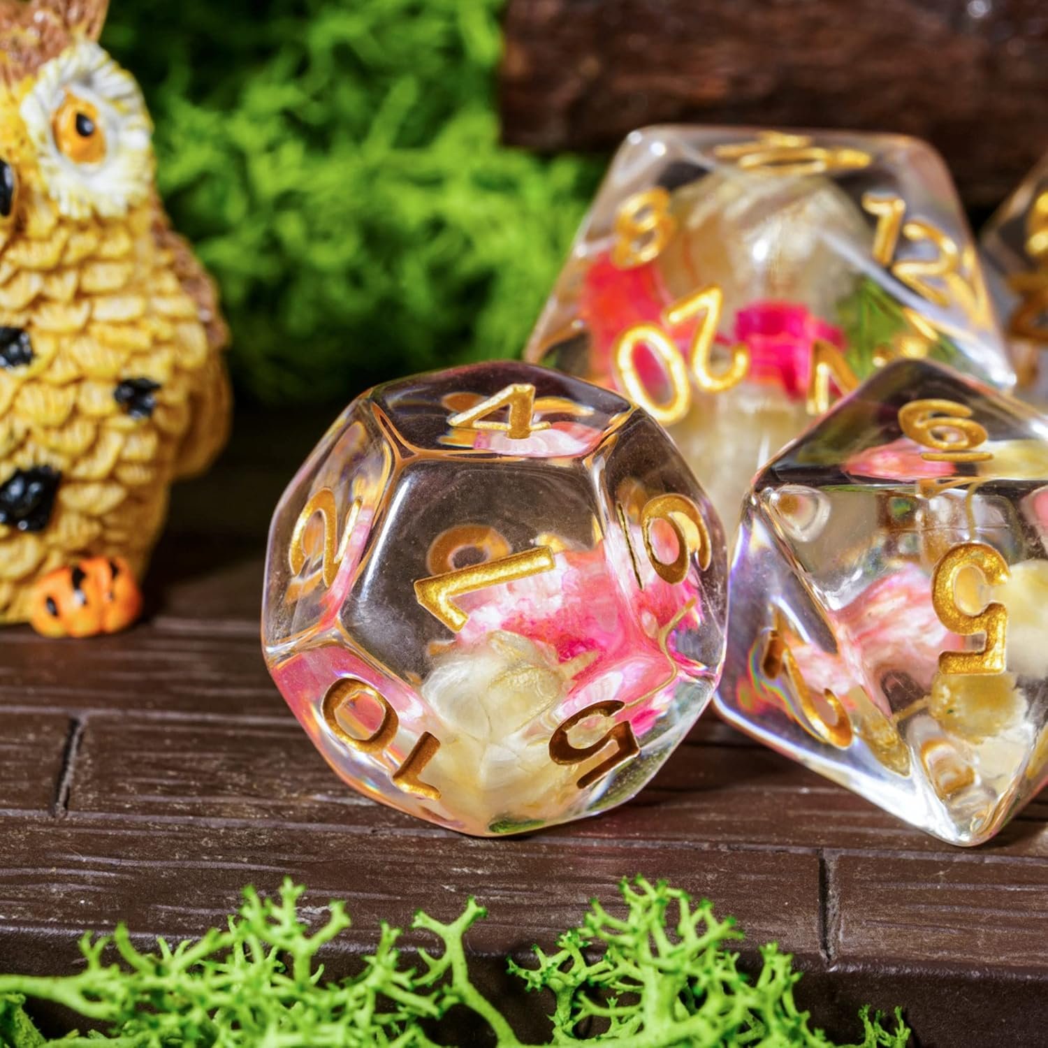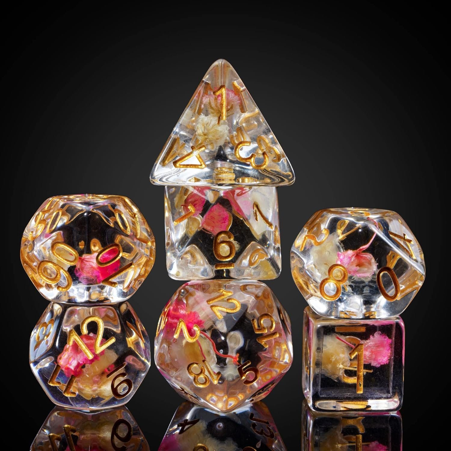 Each die in the set features intricate pink and white floral embedded within the resin, adding a touch of elegance to your gaming experience