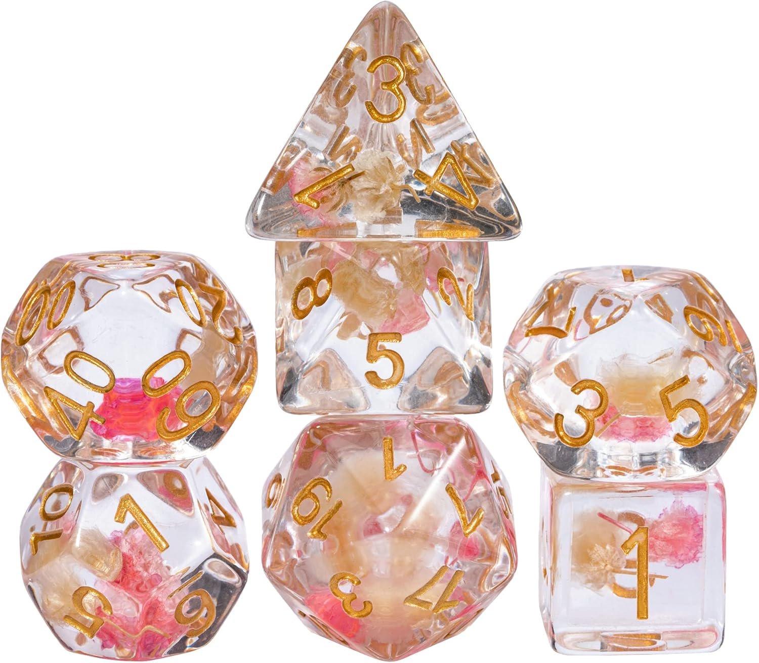 Cusdie 7-Die DND Dice, Polyhedral Dice Set Filled with Flowers, for Role Playing Game Dungeons and Dragons D&D Dice Pathfinder (Rose/White w/Golden Numbers)