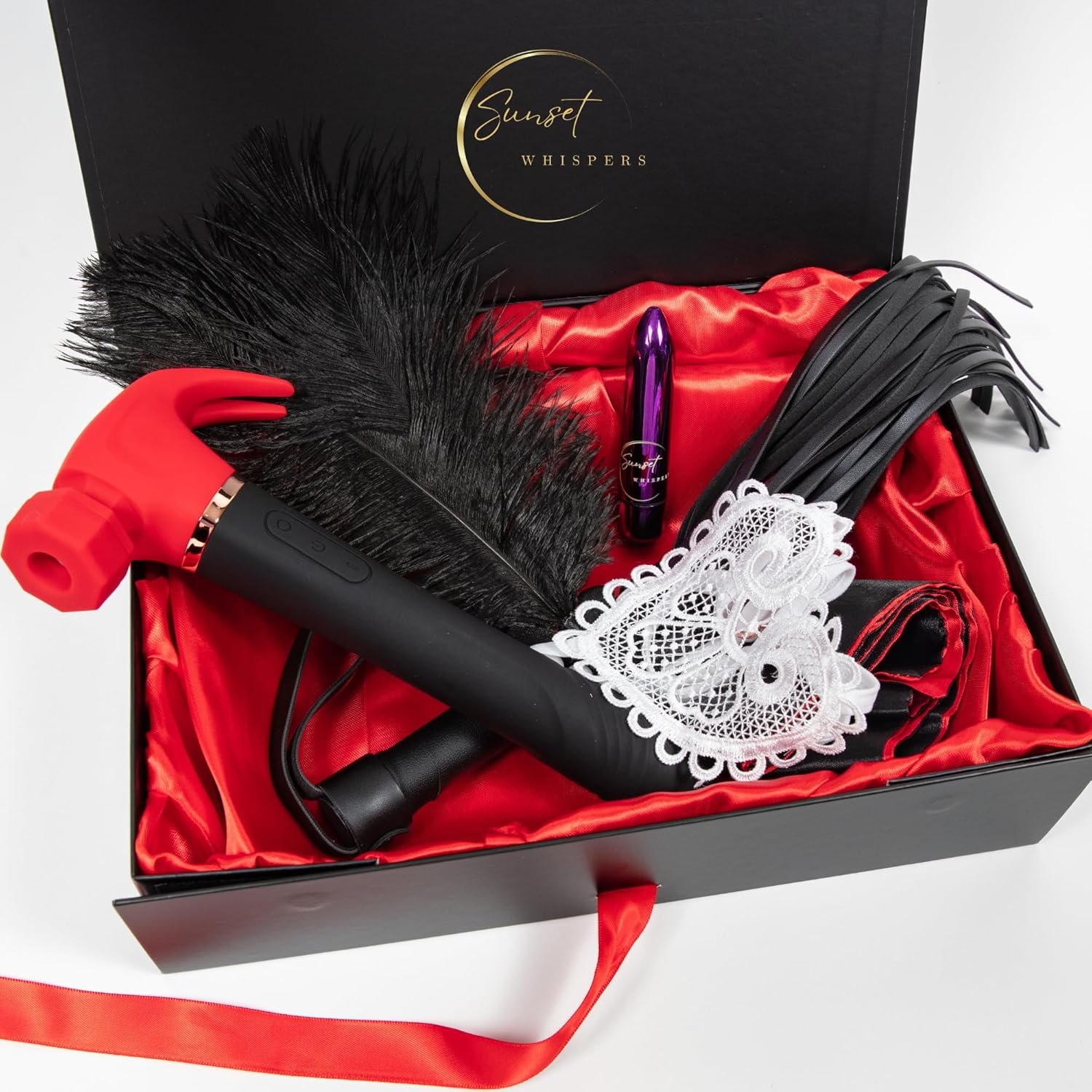 UNLOCK PASSION WITH THE DARK DESIRE 6-PIECE COUPLES SEX TOY KIT: Explore New Realms Of Intimacy And Connection With This Complete Set, Featuring Everything From A Satin Tie/Blindfold To A Flogger , Mini Bullet Vibrator, Feather Tickler, Pearl Panties, And The 18-Mode Sucker Vibration 4-In-1 Love Hammer. Perfect For Couples Looking To Elevate Their Experiences.PERFECT FOR COUPLES SEEKING DEEPER CONNECTION AND TRUST: Whether You’re New To Sex Toys Or Want To Add More Excitement To Your Relationship, The Dark Desire Kit Helps Couples Explore New Levels Of Trust, Control, And Intimate Stimulation.
