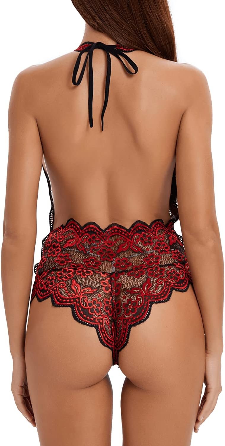 EVELUST Womens Open Back Halter Plunging Teddy,Comfortable Scalloped Trim Lace Lingerie