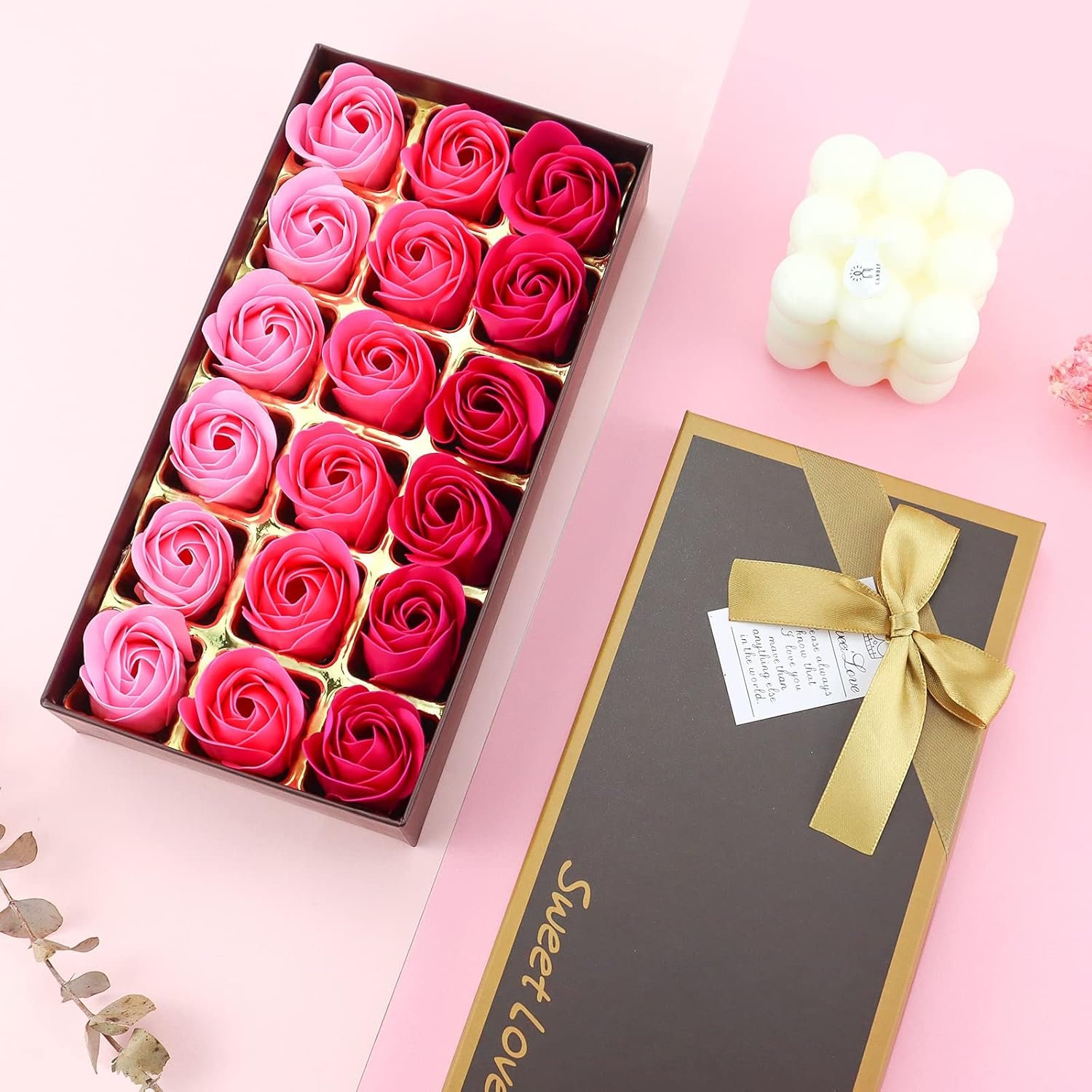 Gift box size: 8.85 x 4.48 x 1.85 in. Come with 18 pcs soap rose in a gift box. Petals Material: Soap(The flower is made of soap which can use to wash hand or any romantic event). Made from the special soap to make sure the rose will not easy to squished during shippment, the soap may not easy to disslove in water.