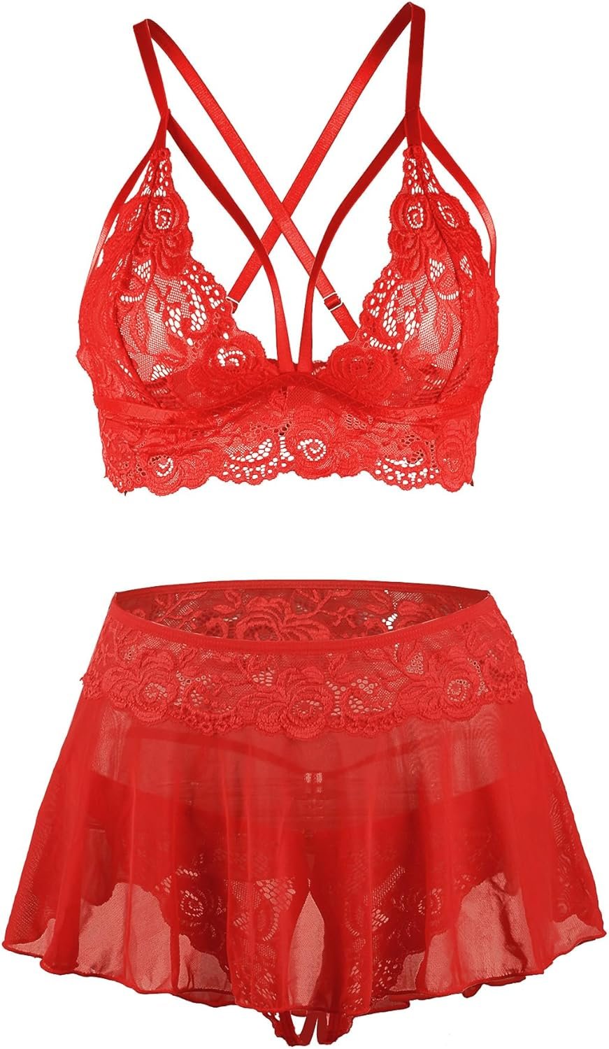 Sexy Lingerie DetailWomen lace lingerie set features sheer lace cups with strappy detailAdjustable spaghetti straps, a hook back closure, a matching sexy lace miniskirt and a lace panty ,spicing up your love.