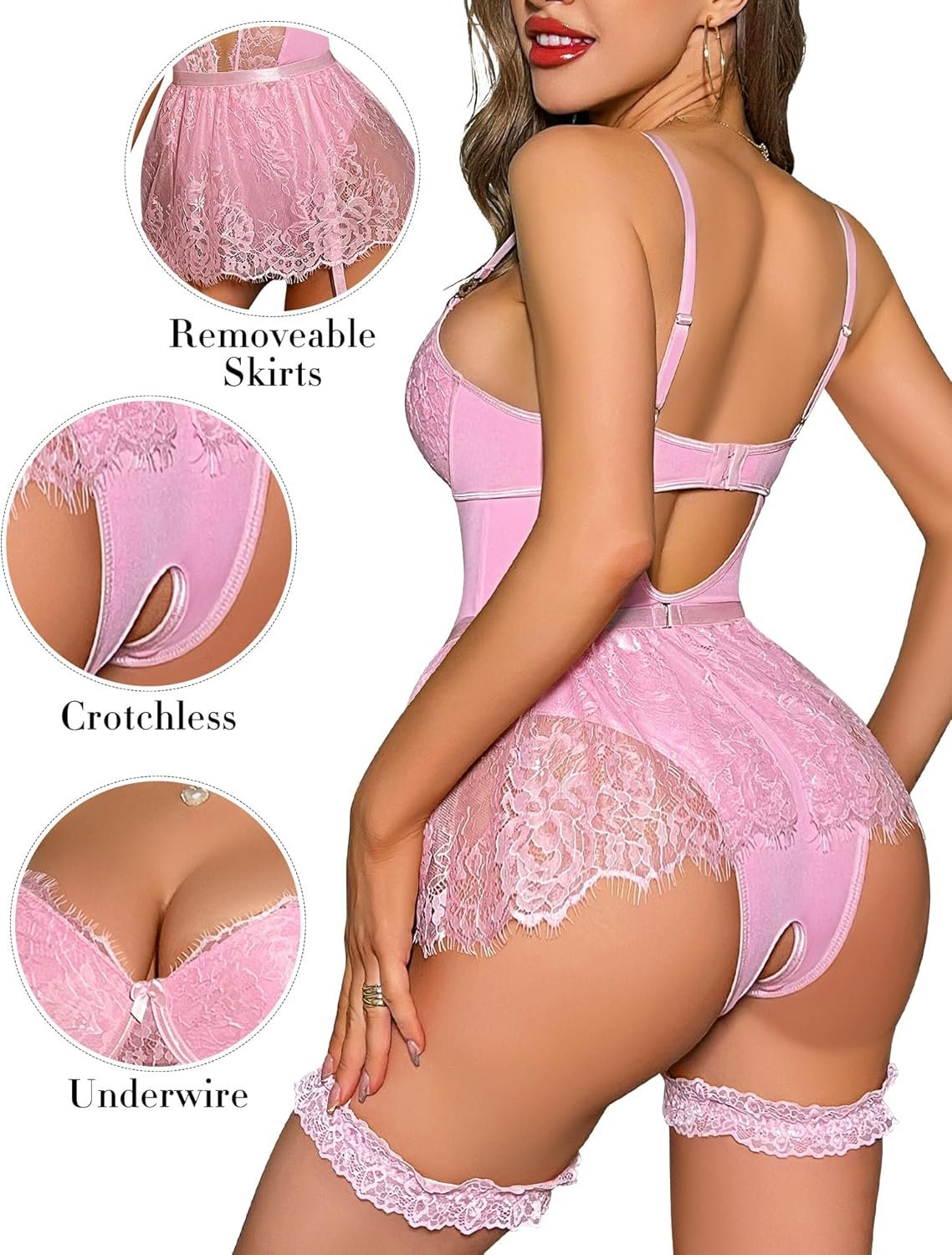 Genhoo Women Babydoll Lingerie with Garter Belt Detachable Lace Mini Skirt Lace Teddy Supportive Bodysuit Set