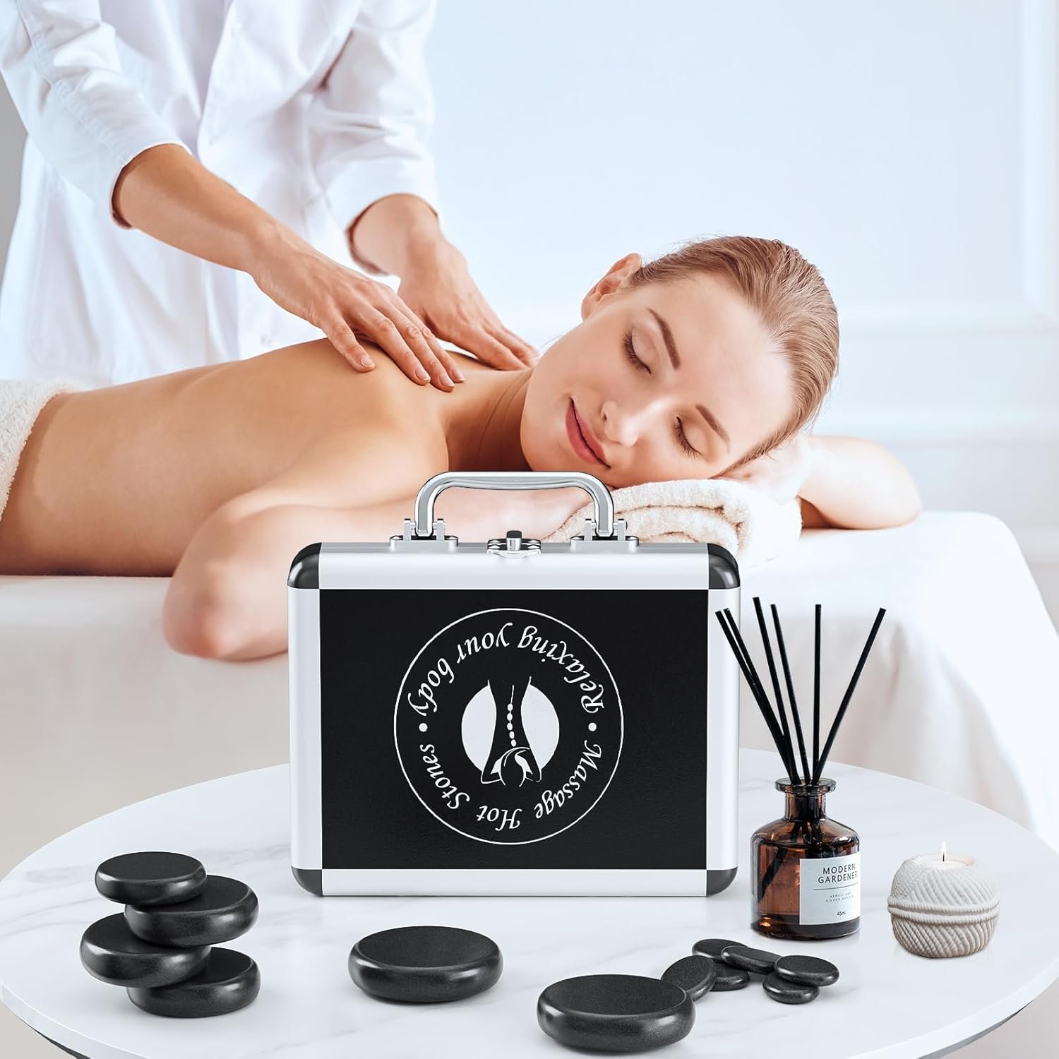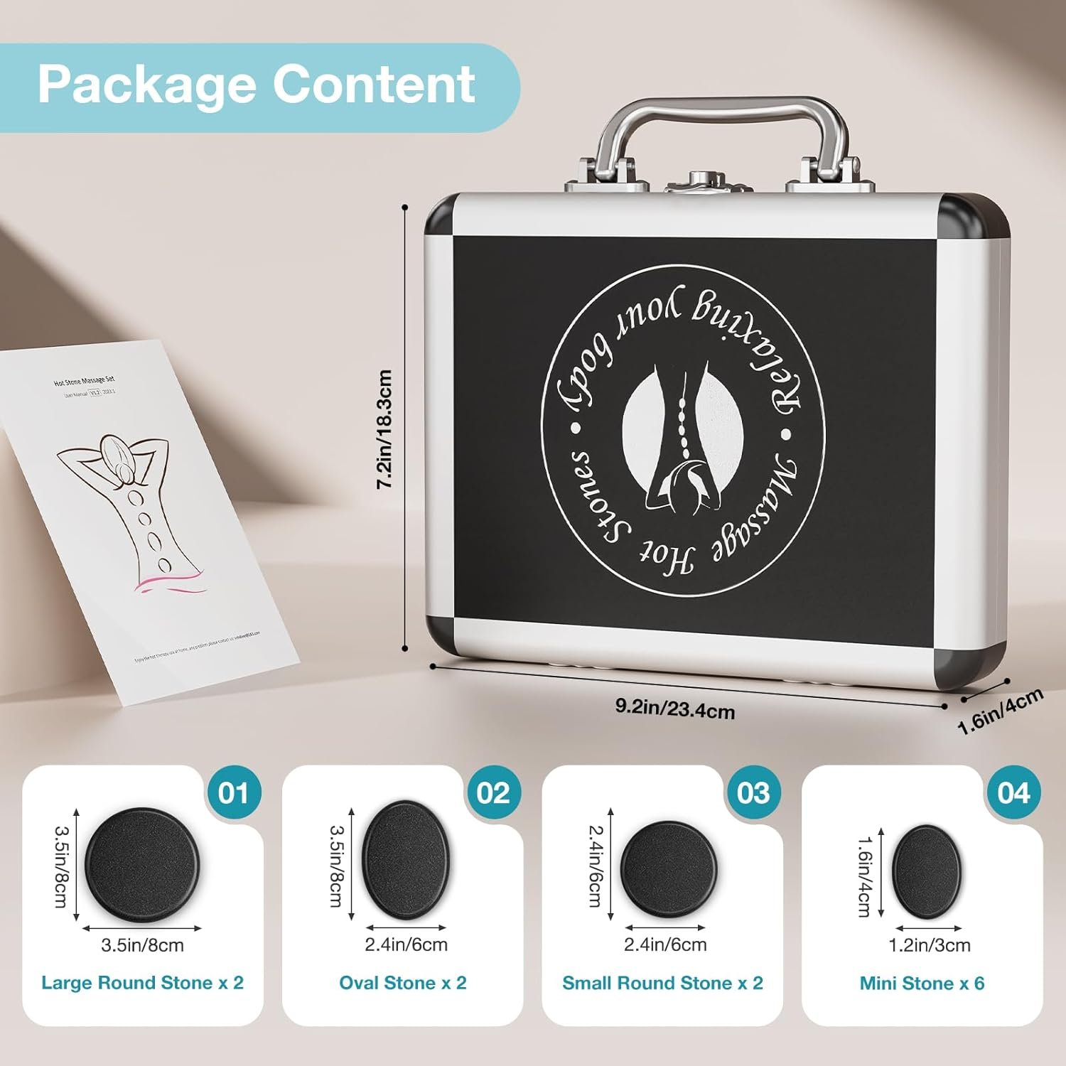 【Portable Hot Stones for Massage with Warmer】The Hot Rocks Massage Stones Kit are easy to use and can be heated when powered on. The heating time is about 20-30 minutes, and the specific time will also fluctuate due to the environment and temperature. The product casing has 4 rubber feet to help dissipate heat and reduce the heat on the surface where it is placed. The narrow briefcase-style outer box is ideal for mobility and can be stored in a closet or under the bed when not in use