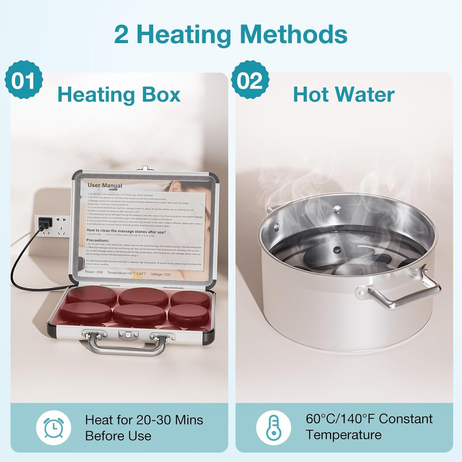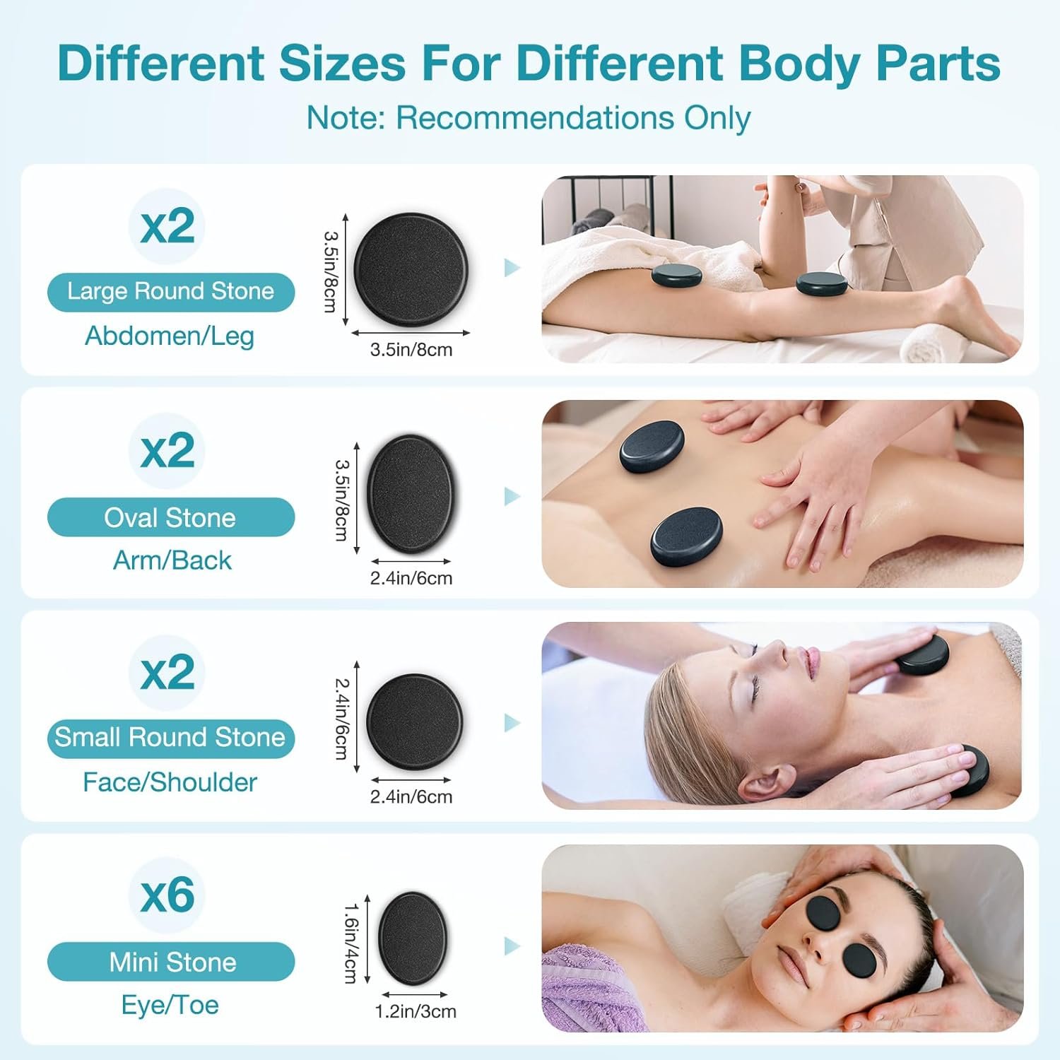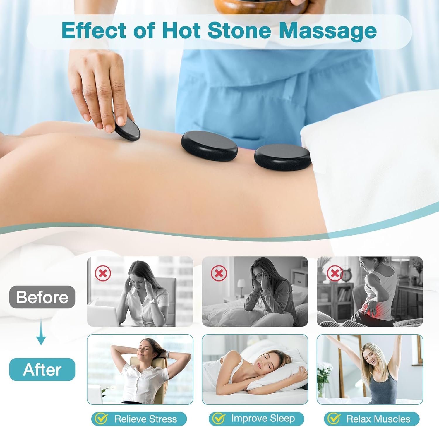 【 Easy to Use】Simply place the Hot Stones for Massage on the liner of the heater case. Connect the power plug and heat the stones for 20-30 minutes, reaching a proper temperature of approximately 122-158°F. Allow them to cool for 2 minutes or wrap them in a towel to prevent burns before applying hot stones to the skin. Use essential oils, and gently slide them on the skin to enhance the absorption of the oils into the skin, promoting overall body relaxation