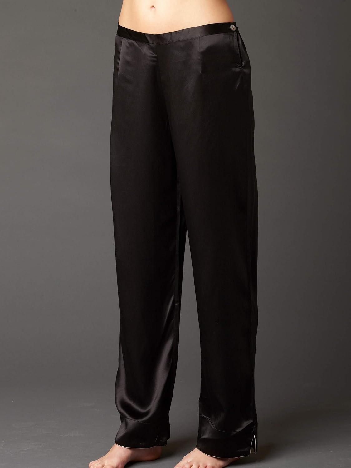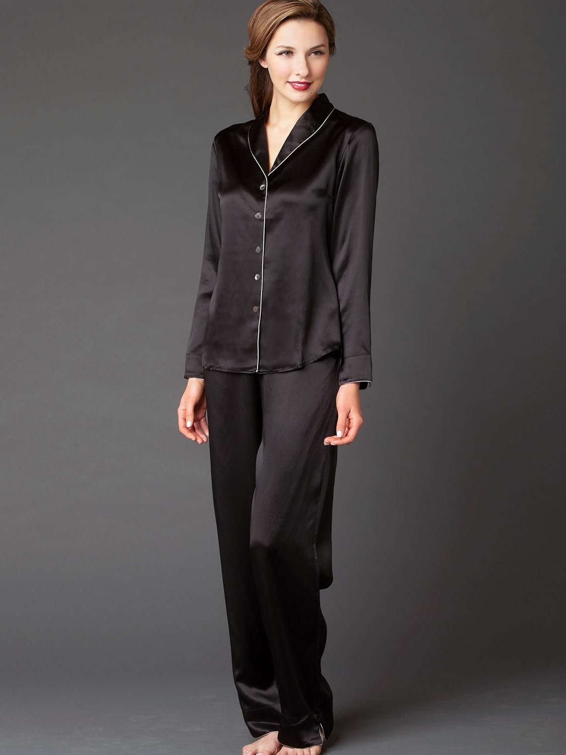 Thousands upon thousands of sumptuous silk threads are woven together to make this gorgeous pajama amazingly soft and luscious. Bust darts, a shirt tail hem, and hidden seams and tucks give this silk pajama an impeccably tailored look yet ensures a relaxed fit. A contrast silken cord feminizes a modern collar and adds beautiful detail to a vented sleeve cuff and pant hem. Darted flat front pajama pants with a side button and back elastic keep everything sleek and comfortable. Also available in Petites! Click here.